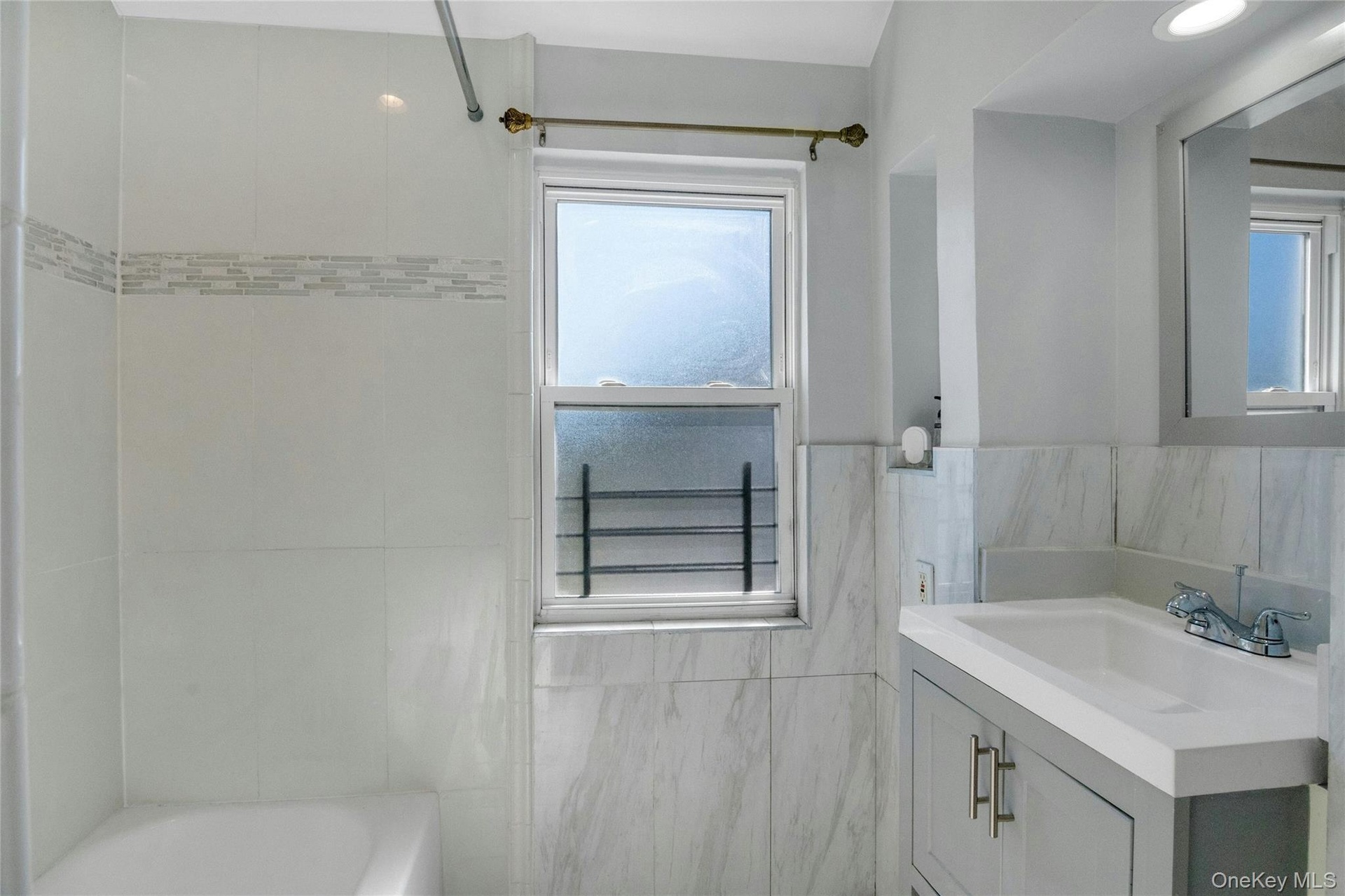 - Bathroom featuring vanity, tile walls, and bathtub / shower combination