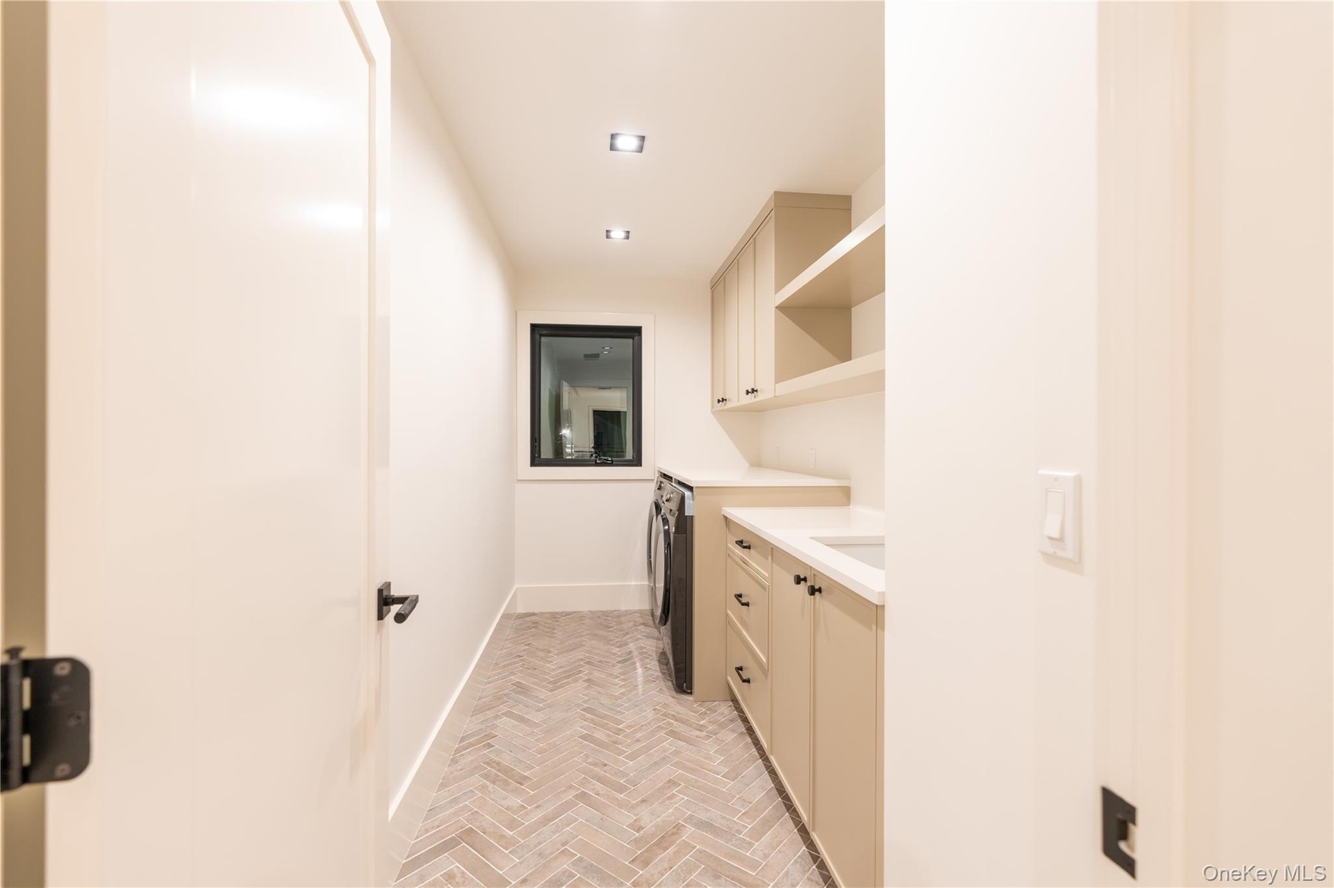 - Laundry room featuring brick flooring, cabinet space, and washer and clothes dryer
