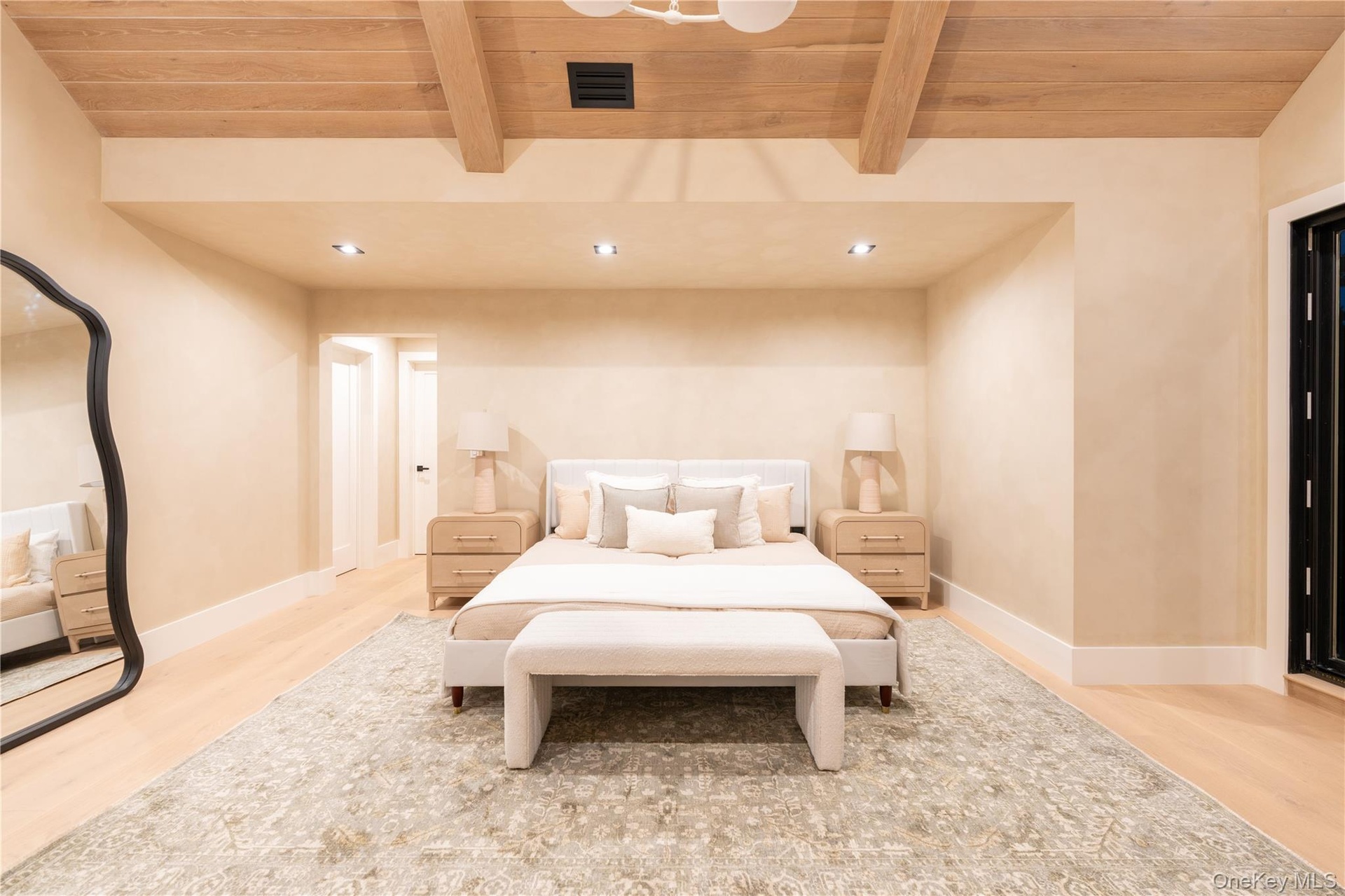 - Bedroom with high vaulted ceiling, light wood finished floors, a wooden ceiling with exposed beams, and recessed lighting