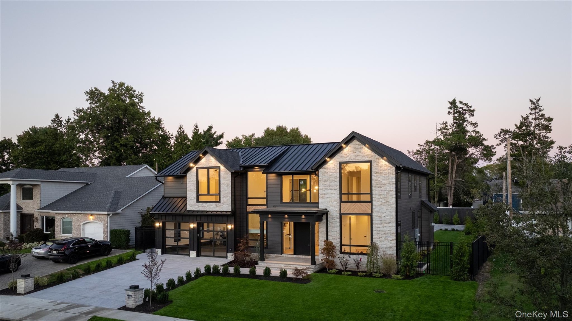 - Contemporary house with a standing seam roof, a metal roof, an attached garage, concrete driveway, and brick siding