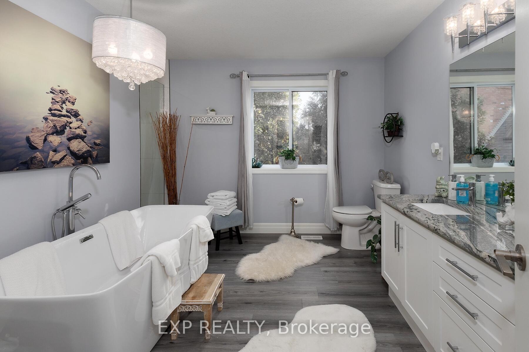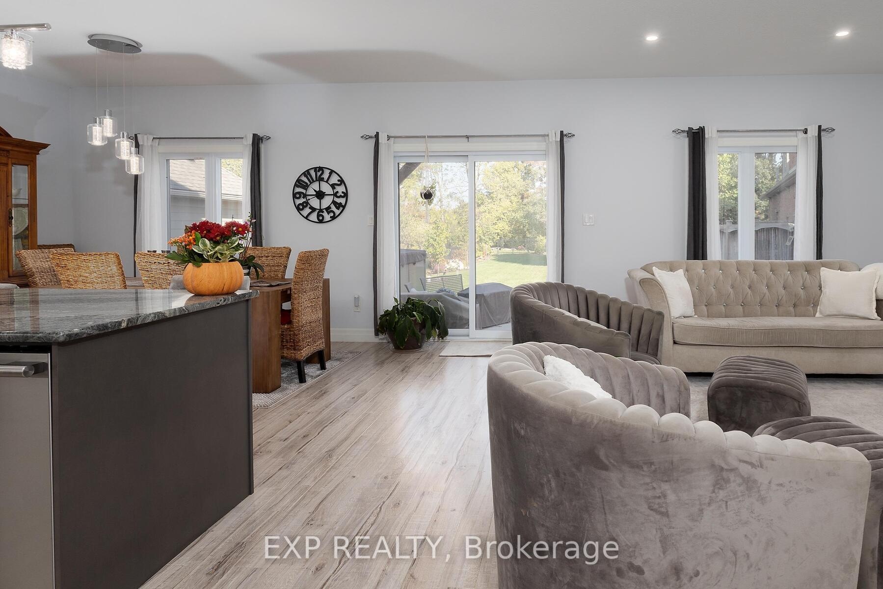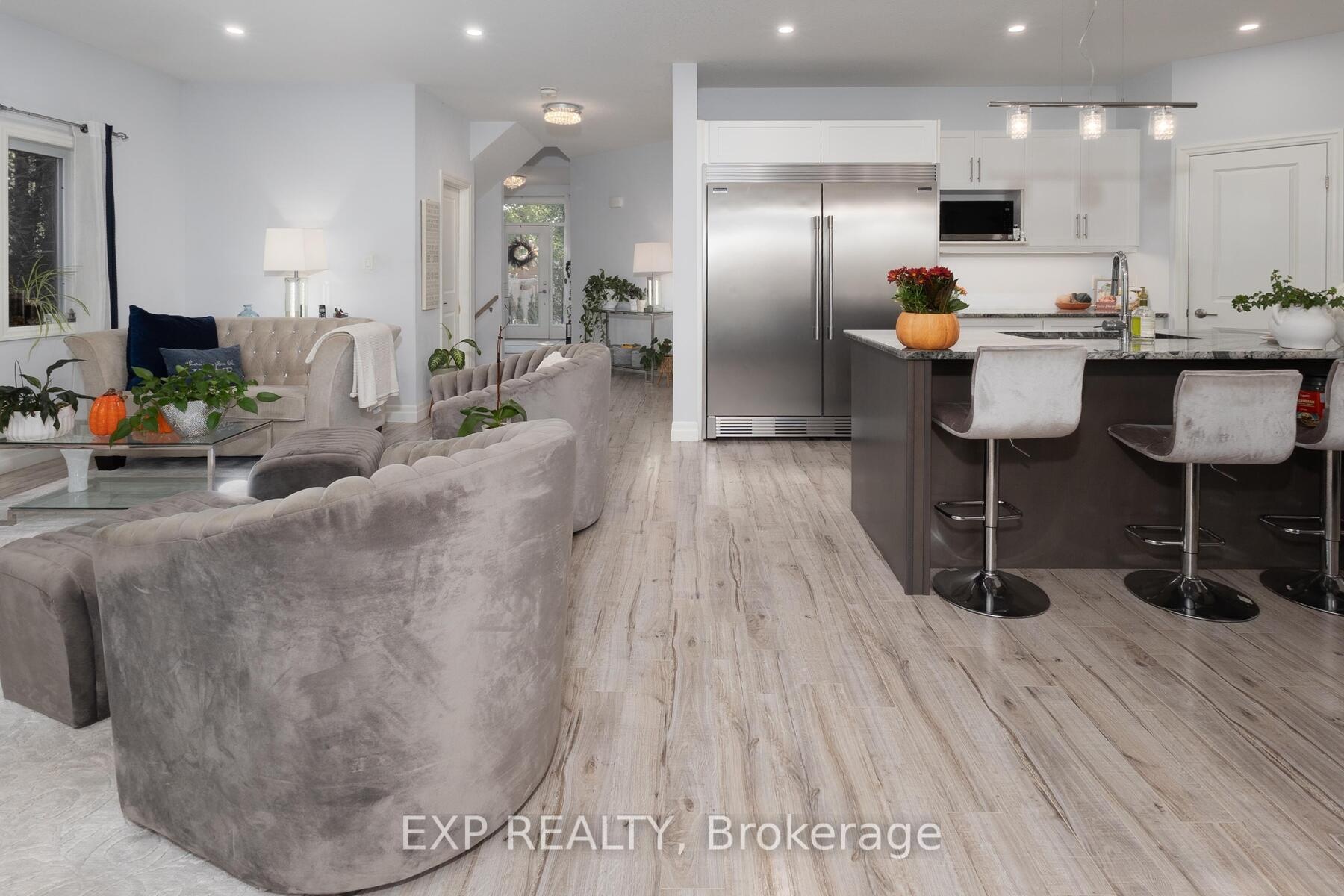 DescriptionSituated on a beautifully landscaped lot backing onto a scenic ravine with the Thames River below, this stunning lot measures approx 42ft wide and 180ft (plus) deep, offering a rare blend of privacy and nature. With a fully fenced backyard and an expansive heated above-ground swim spa this property is a true retreat. The oversized cement driveway allows for triple-wide parking, leading to a spacious two-car garage with a separate man-door, dual openers, and direct access to a main-floor laundry/mudroom. Inside, enjoy 9-foot ceilings and an open-concept kitchen/family room featuring a large island, granite countertops, ceramic flooring, and stainless steel appliances including a fridge/freezer combo, stove, dishwasher, washer, and dryer. The upper level features a luxurious primary suite thats a must-see. Measuring 17' x 24', it offers two large windows with views of the backyard with the Thames River beyond, an oversized walk-in closet, and a spa-like 5-piece ensuite with a soaker tub and dual sinks. Two additional bedrooms share a 4-piece bath. The finished lower level includes a rec room with two large windows, a 3-piece bath, and a bright bedroom. The lower level also features a dedicated fruit cellar and a utility space which is fitted with a natural gas furnace, central air, 200 amp service, sump pump, owned water softener, rented on-demand water heater, and a dedicated fruit cellar.Amenities- Auto Garage Door Remote
