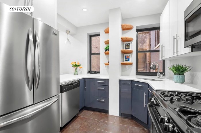 Fall in love with this beautifully renovated two-bedroom, two-bathroom home. Thoughtfully reconfigured with an efficient layout, Unit 2E is designed to maximize space and storage. The spacious, windowed kitchen opens seamlessly into a bright and airy living room, anchored by a sleek stone breakfast bar. Featuring stainless steel appliances, modern cabinetry, and stylish hardware, this kitchen is functional for everyday living and entertaining.
