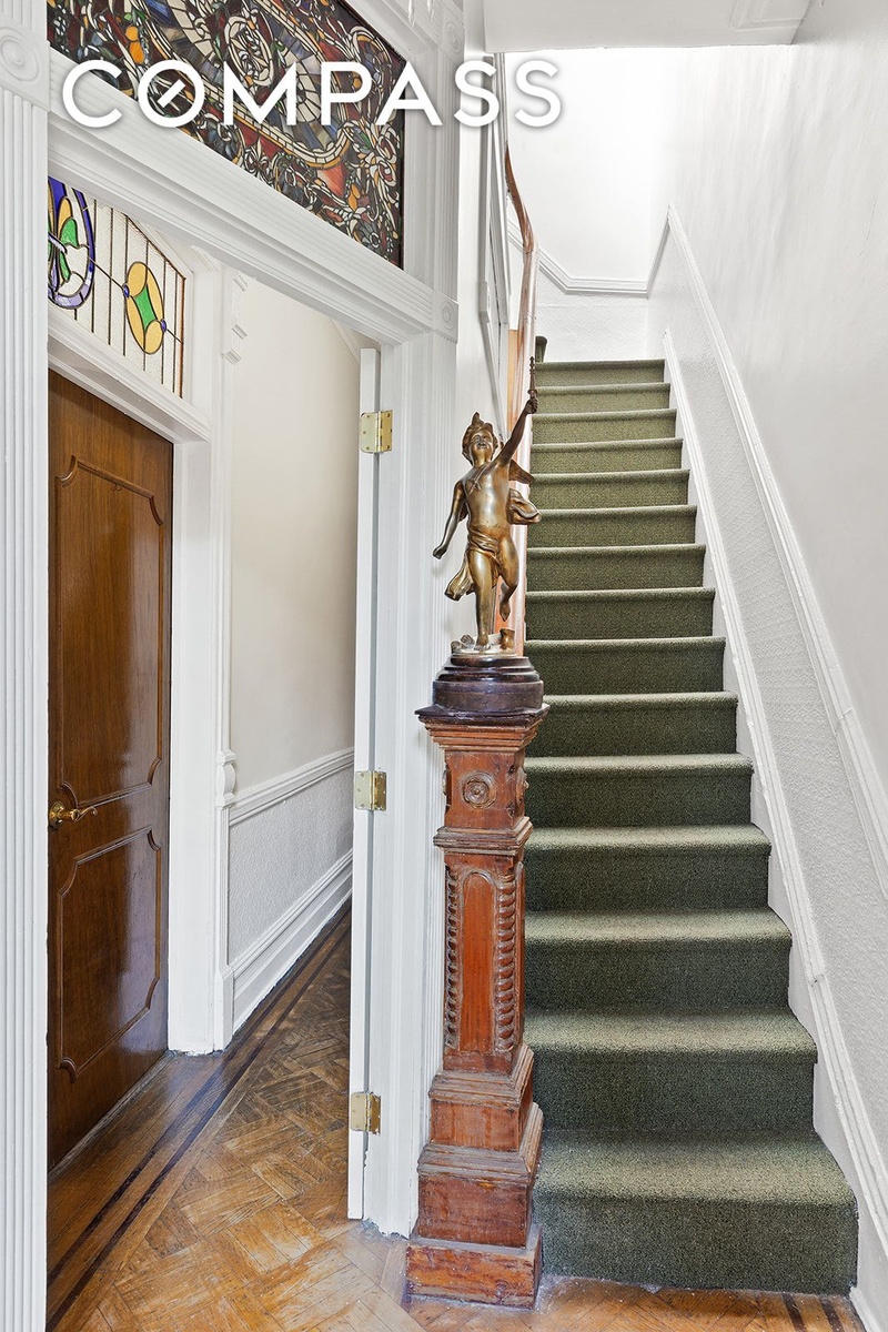 Inside, the original encaustic tile and vestibule door are intact, but the real star of the foyer is the rare cherub newel post gas lamp. There are so few of these left in Bed-Stuy, it’s a pleasure to see this one has remained to greet your return home.