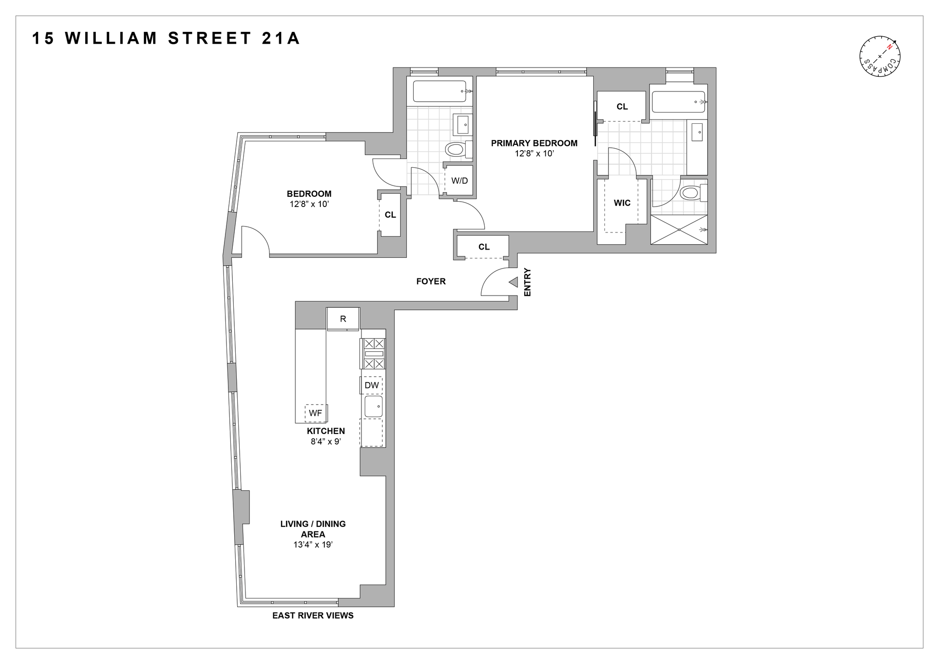 Perched on a high floor at 15 William Street, this two bedroom, two bathroom residence combines luxury finishes with sweeping views of the East River and downtown skyline.
