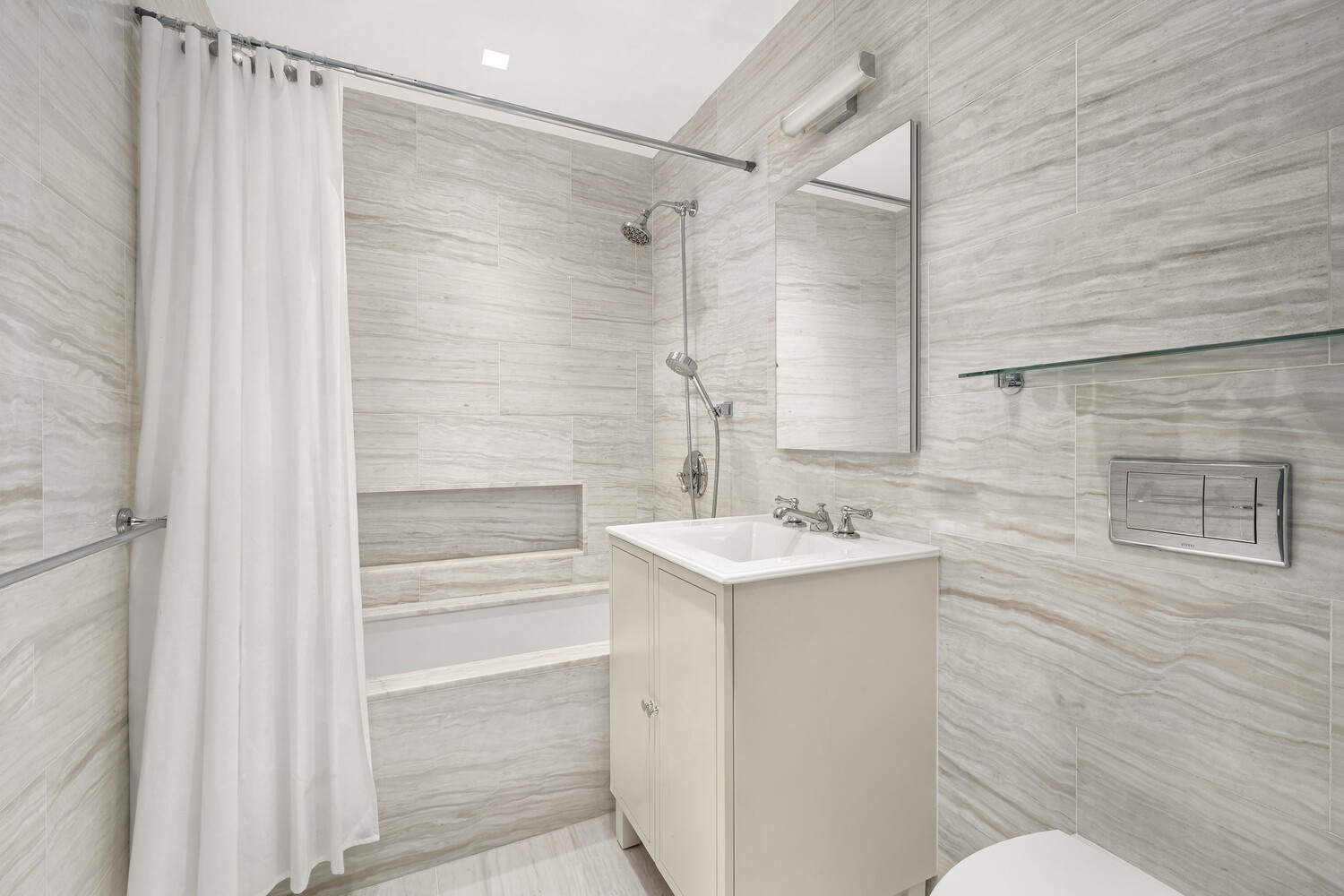 The primary bedroom faces East and provides a serene oasis from the city. The room is picturesque and bright featuring a stunning hall of completely built-out and extensive California Closets with Waterworks light fixtures and high end Buster + Punch hardware. The primary bathroom creates the perfect spa-like escape with dual sinks, radiant floor heating, Kallista hardware, floor to ceiling marble, gorgeous stainless appliances and a tasteful, spacious tiled shower. The second bedroom which is large in size offers city views to the North. This bedroom features a large closet and a chic en-suite marble bathroom with radiant floor heating, a custom vanity and shower / soaking tub. Each room in this modern home features custom electric shades truly elevating this space.