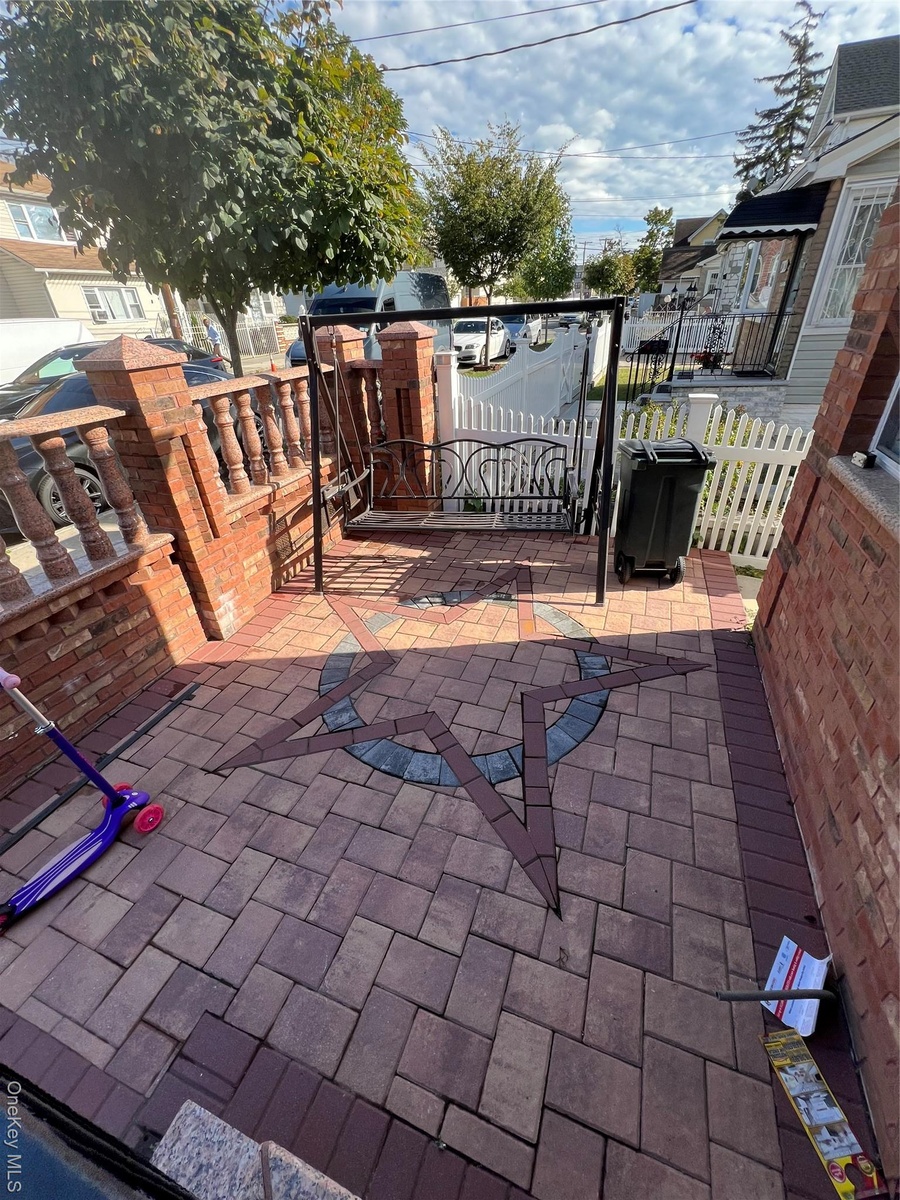 - View of front of property featuring a gate, a fenced front yard, and brick siding