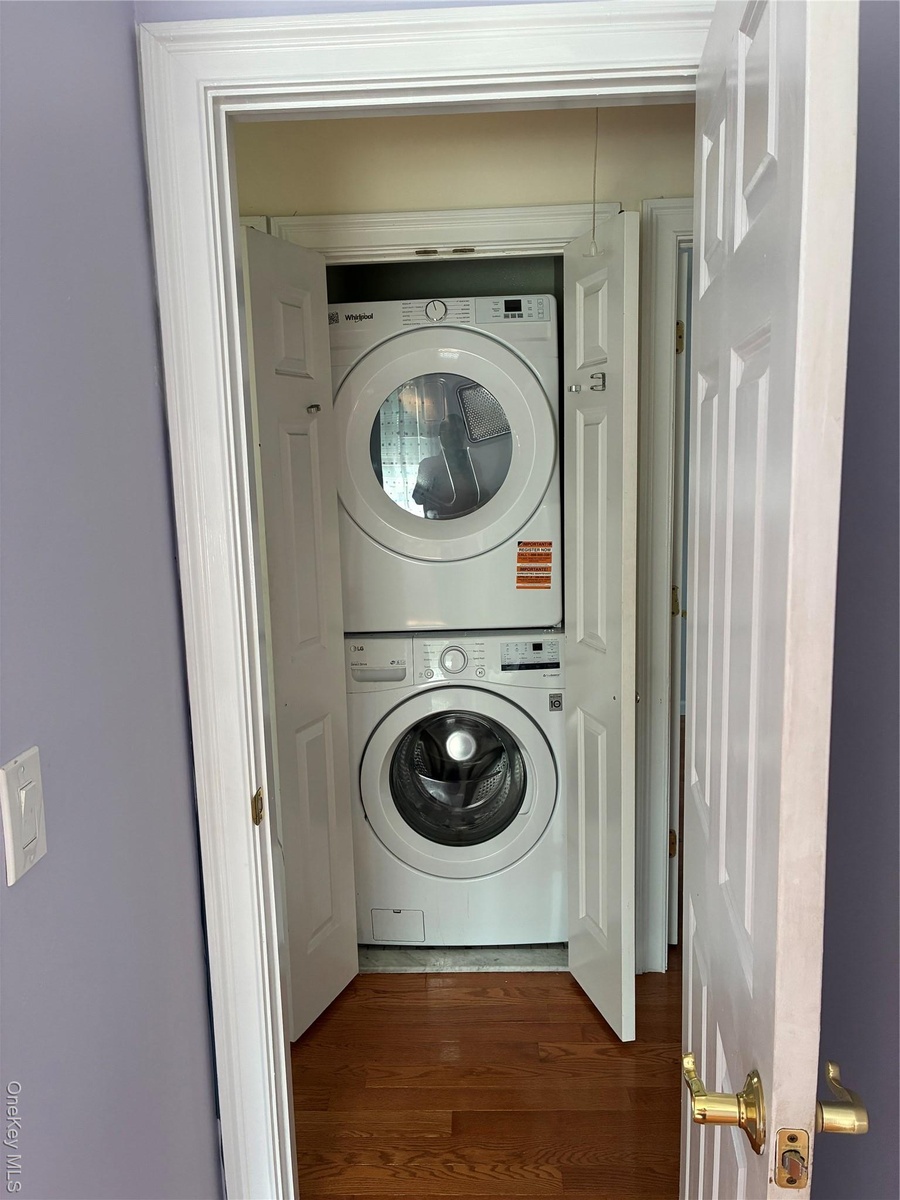 - Laundry area with dark wood finished floors and stacked washer and clothes dryer