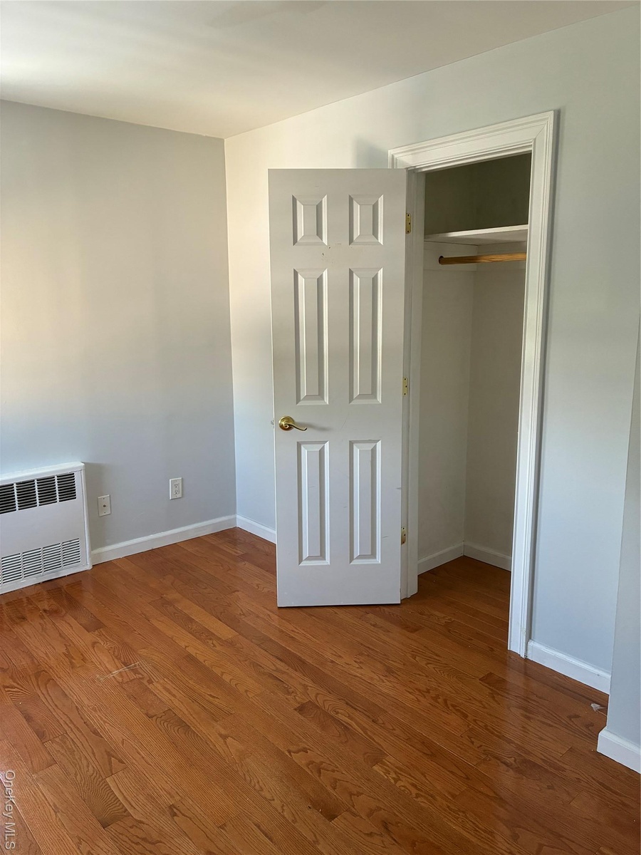 - Unfurnished bedroom with dark wood-style flooring, radiator, and a closet