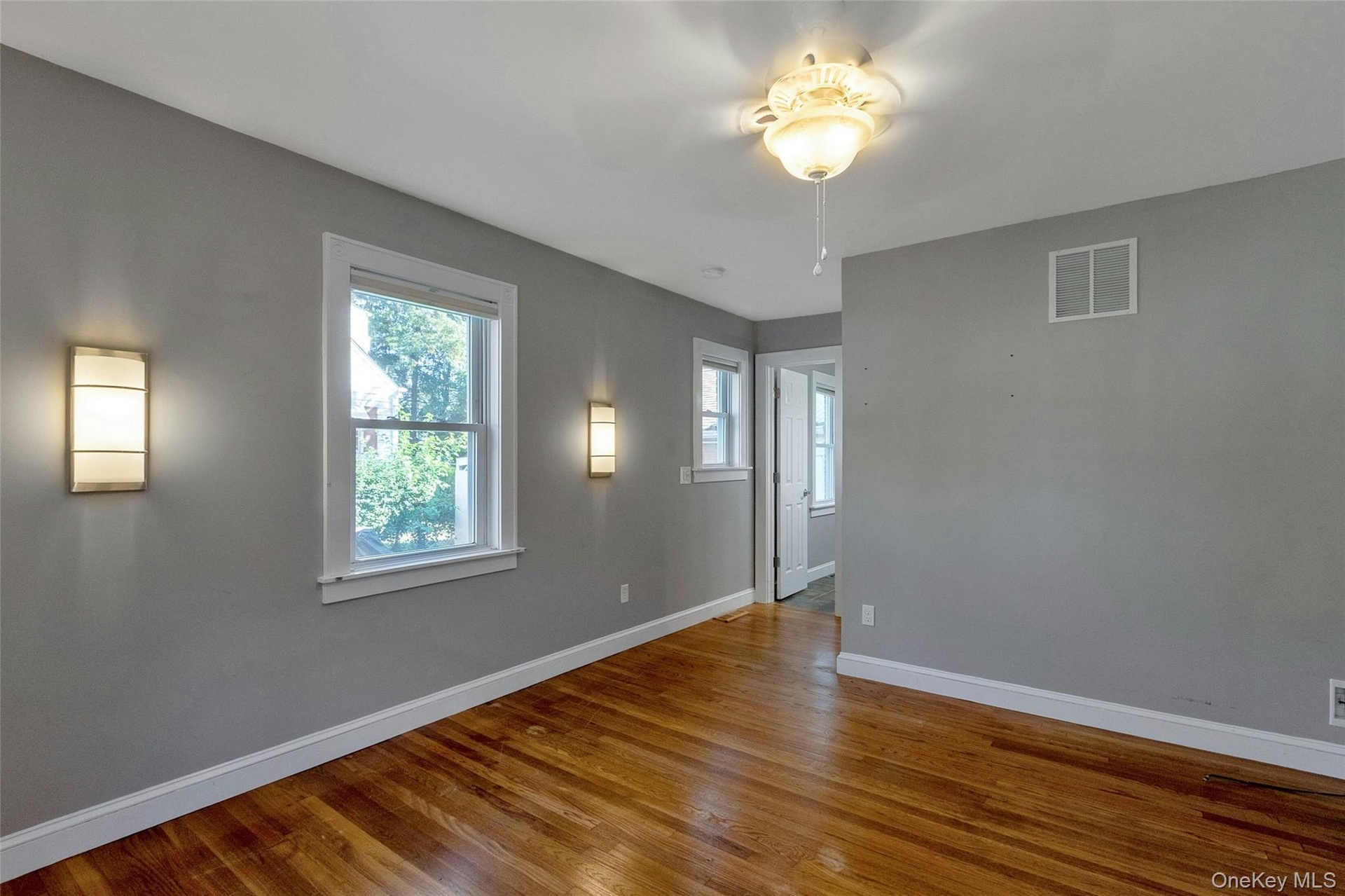 Upstairs, a neutral carpeted staircase leads to three additional bedrooms, each spacious and bright with hardwood floors, sloped ceilings, and skylights that add character and charm.