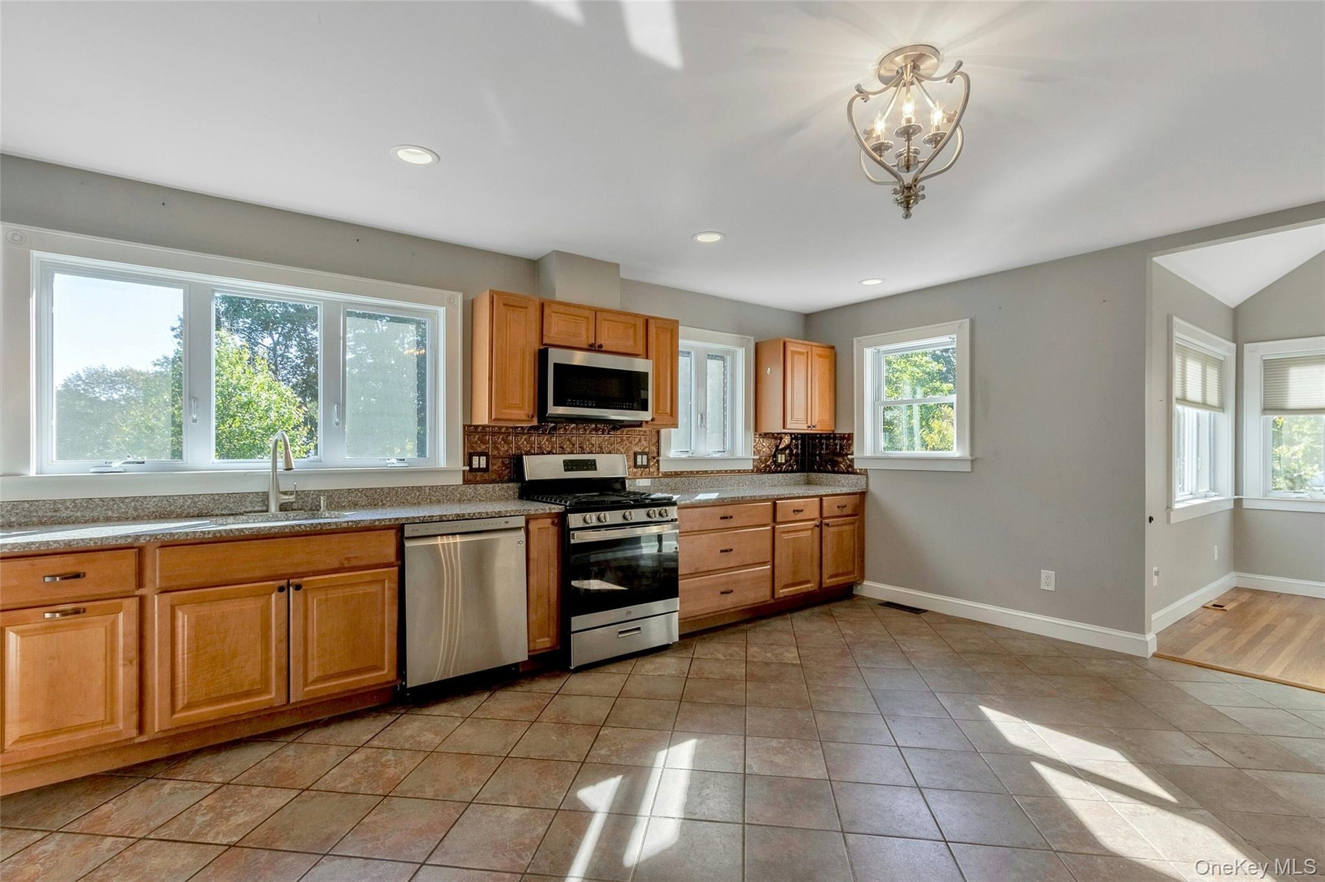 - Kitchen with stainless steel appliances, light tile patterned floors, recessed lighting, light stone countertops, and tasteful backsplash