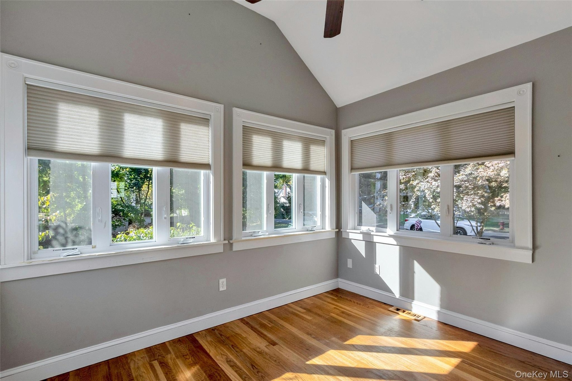 - Empty room with wood finished floors, vaulted ceiling, and ceiling fan