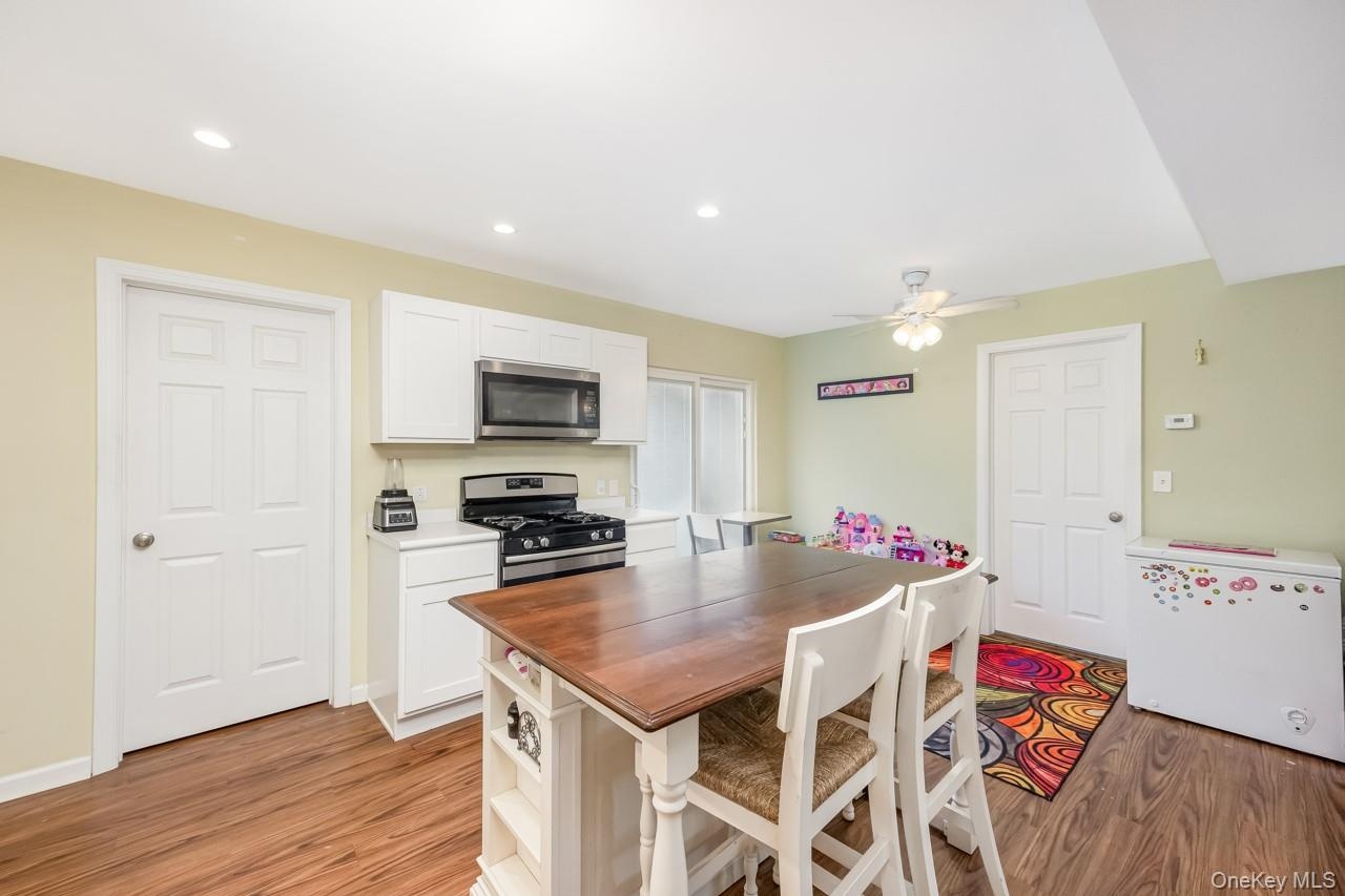 - Kitchen featuring stainless steel appliances, white cabinetry, light wood-style floors, recessed lighting, and a ceiling fan