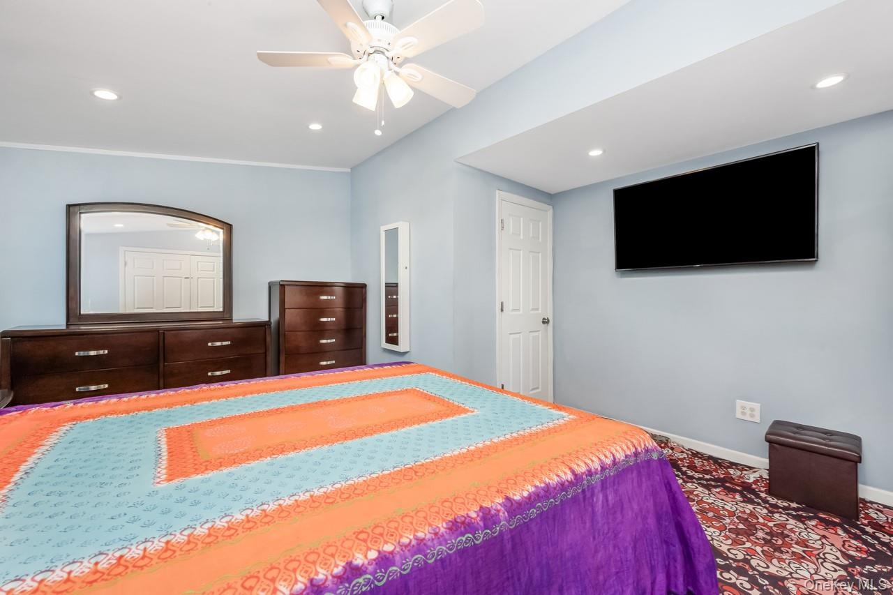 - Bedroom featuring recessed lighting, ceiling fan, and carpet