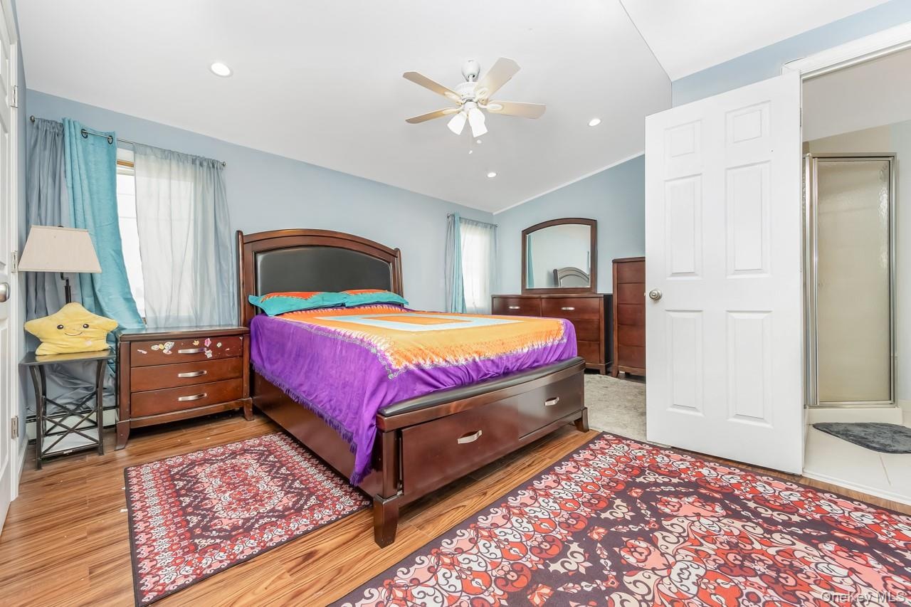 - Bedroom with recessed lighting, a ceiling fan, light wood finished floors, and lofted ceiling