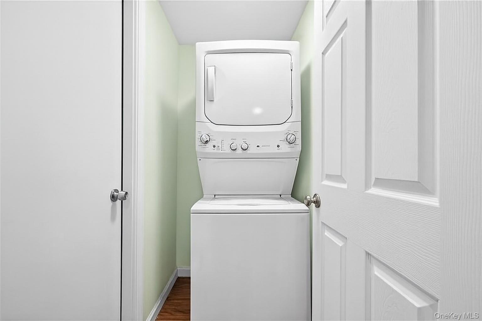 - Laundry area featuring estacked washer and dryer and dark wood finished floors