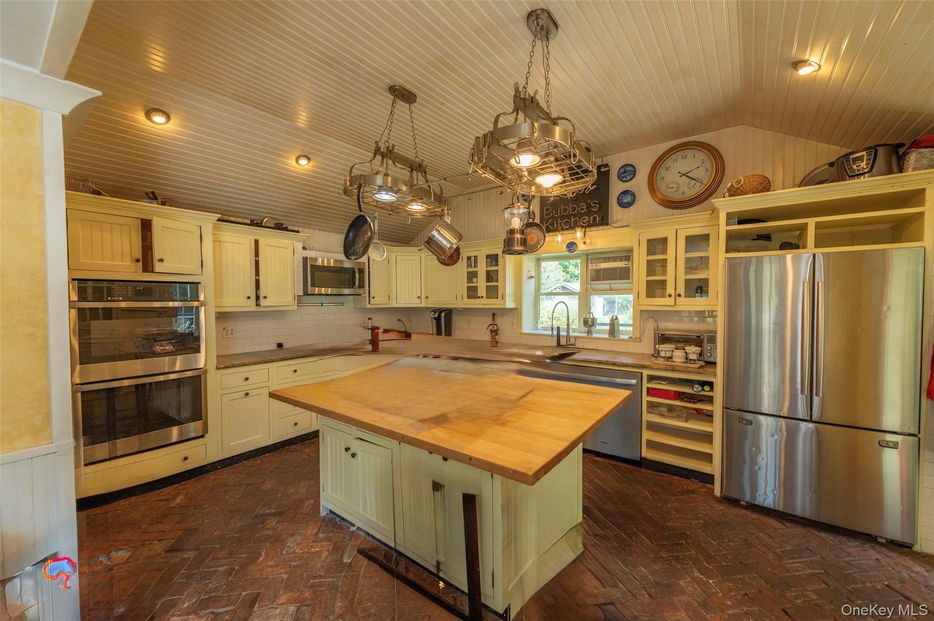 - Kitchen featuring appliances with stainless steel finishes, wood counters, brick floors, hanging light fixtures, and vaulted ceiling