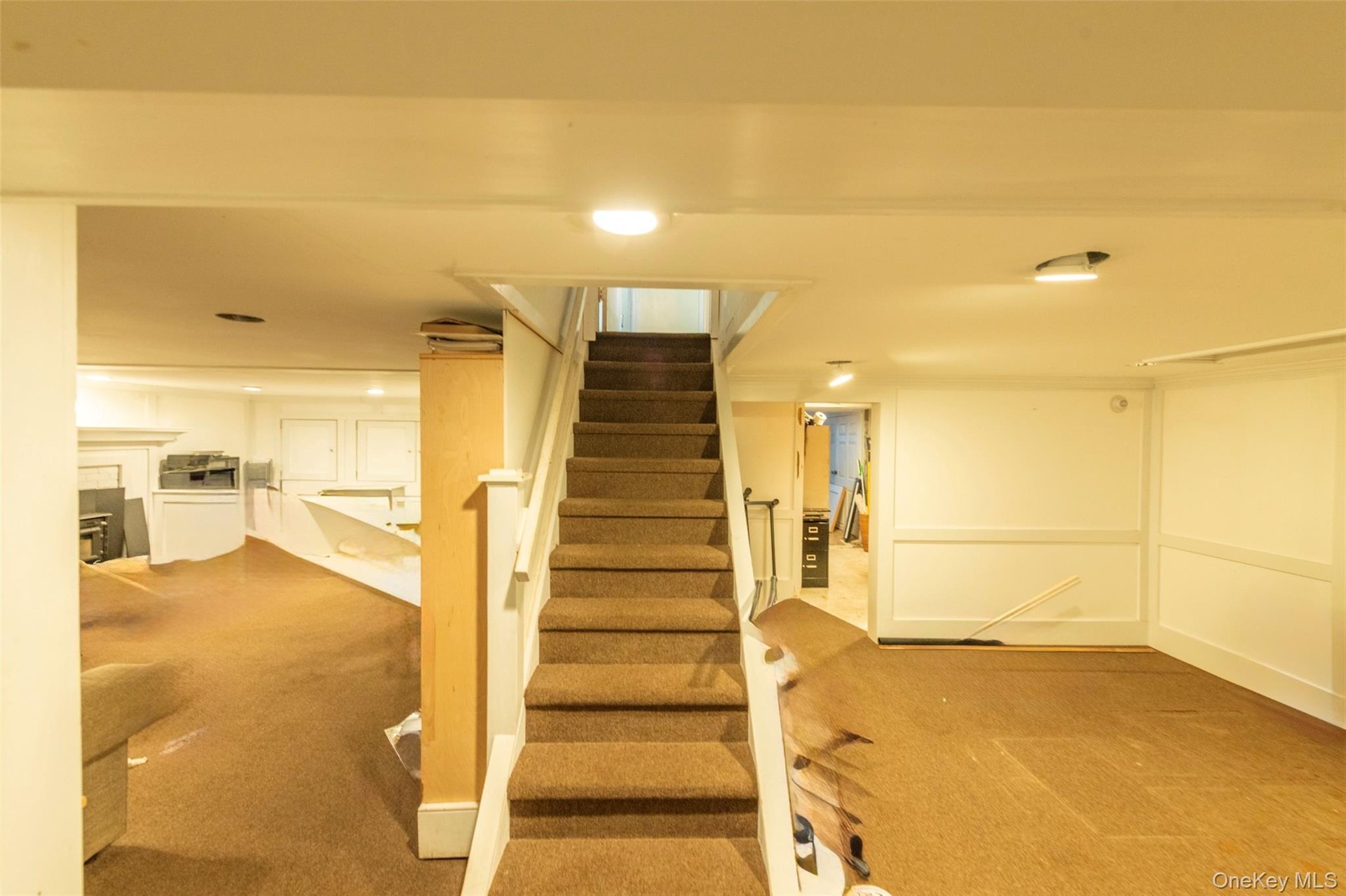 - Finished below grade area featuring a decorative wall, crown molding, stairway, and carpet