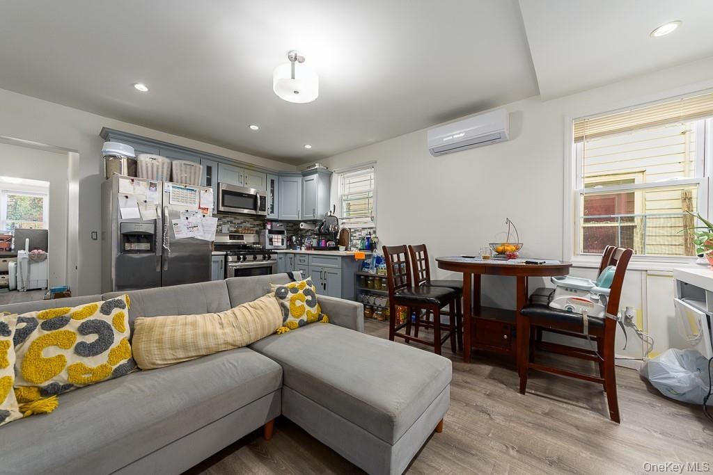 - Living area with light wood-type flooring, an AC wall unit, and recessed lighting