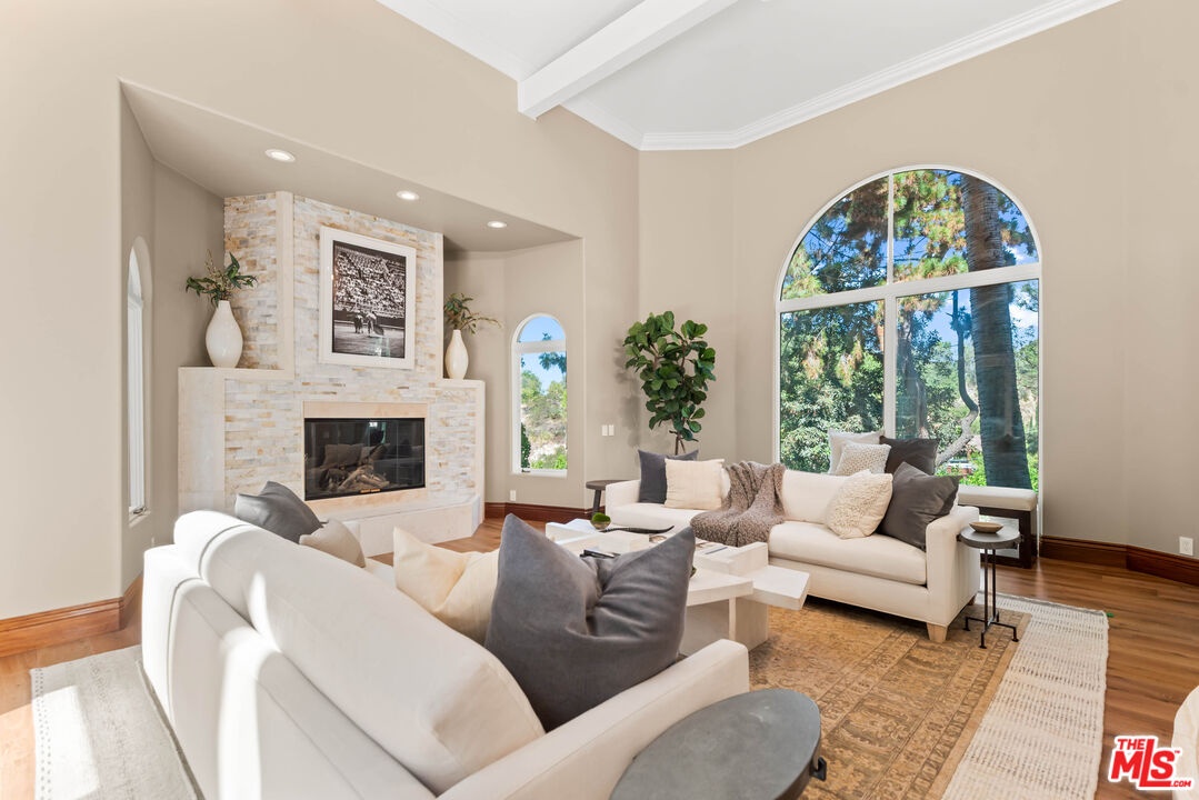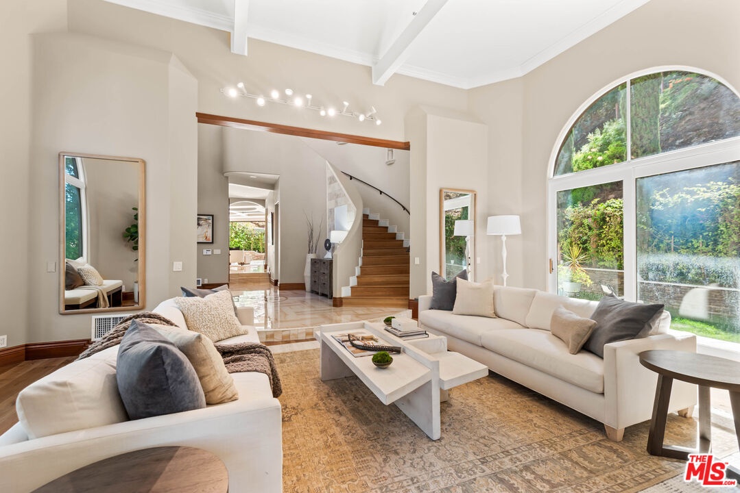 Step through the grand two-story entry with stunning chandelier, where soaring ceilings and architectural drama set the tone for the home. Adjacent living room invites both formal entertaining and intimate gatherings, while a conveniently located first-floor en-suite bedroom and private office offer comfort and flexibility for modern living. Upstairs, three additional generously proportioned en-suite bedrooms provide comfort and privacy. The primary suite is a true retreat, featuring expansive his-and-hers closets, dual private balconies, and a luxurious spa-inspired bath adorned with custom glasswork, a freestanding soaking tub, and a bidet. At the heart of the home, the chef's kitchen is a true showpiece, outfitted with top-of-the-line appliances, expansive counter spaces enabling efficient preparations for groups both large and small. Designed for culinary artistry the kitchen connects directly to entertaining spaces including the pool, covered outdoor loggia and a stylish bar, perfect for lively elevated entertaining or effortless smaller gatherings. Privately gated and set on a secluded flag lot quietly well distanced from Coldwater Canyon Drive, this estate has been completely re-envisioned and masterfully re-constructed over a two-year transformation, offering a rare combination of privacy, seclusion, and modern sophistication. The grounds unfold into a completely private backyard sanctuary with lush gardens, curated landscaping, sparkling pool and spa, and outdoor kitchen. Multiple covered lounges and al fresco dining areas overlook an intimate live-performance stage with professional sound perfect for private concerts and unforgettable gatherings. Bordered by acres of natural terrain and wildlife, the property feels worlds away while remaining uniquely convenient to both Beverly Hills as well as the Valley, with seamless access to world-class amenities. This is more than a home - it is an unparalleled lifestyle, a sanctuary designed for those who seek beauty, privacy, and distinction.
