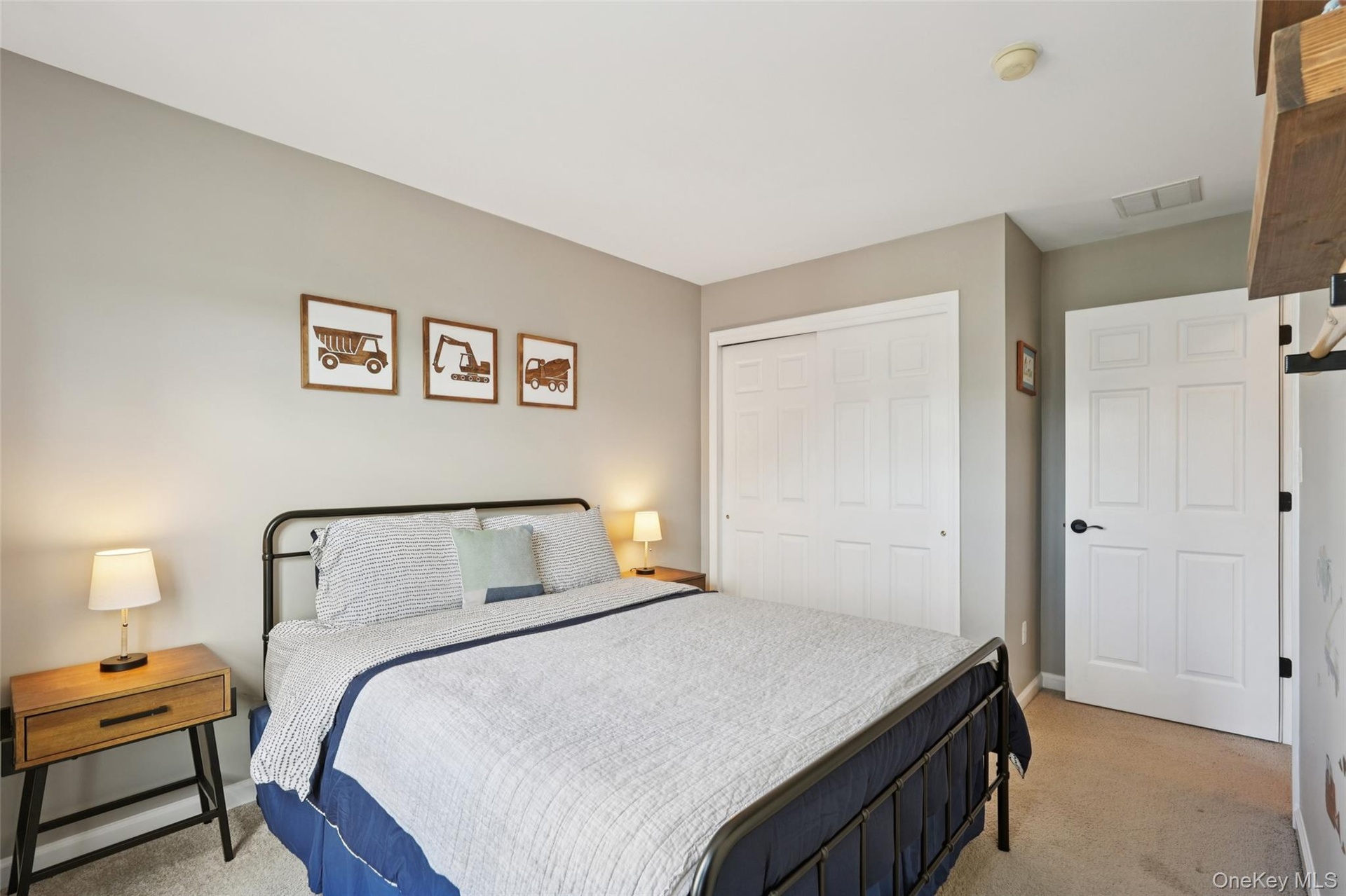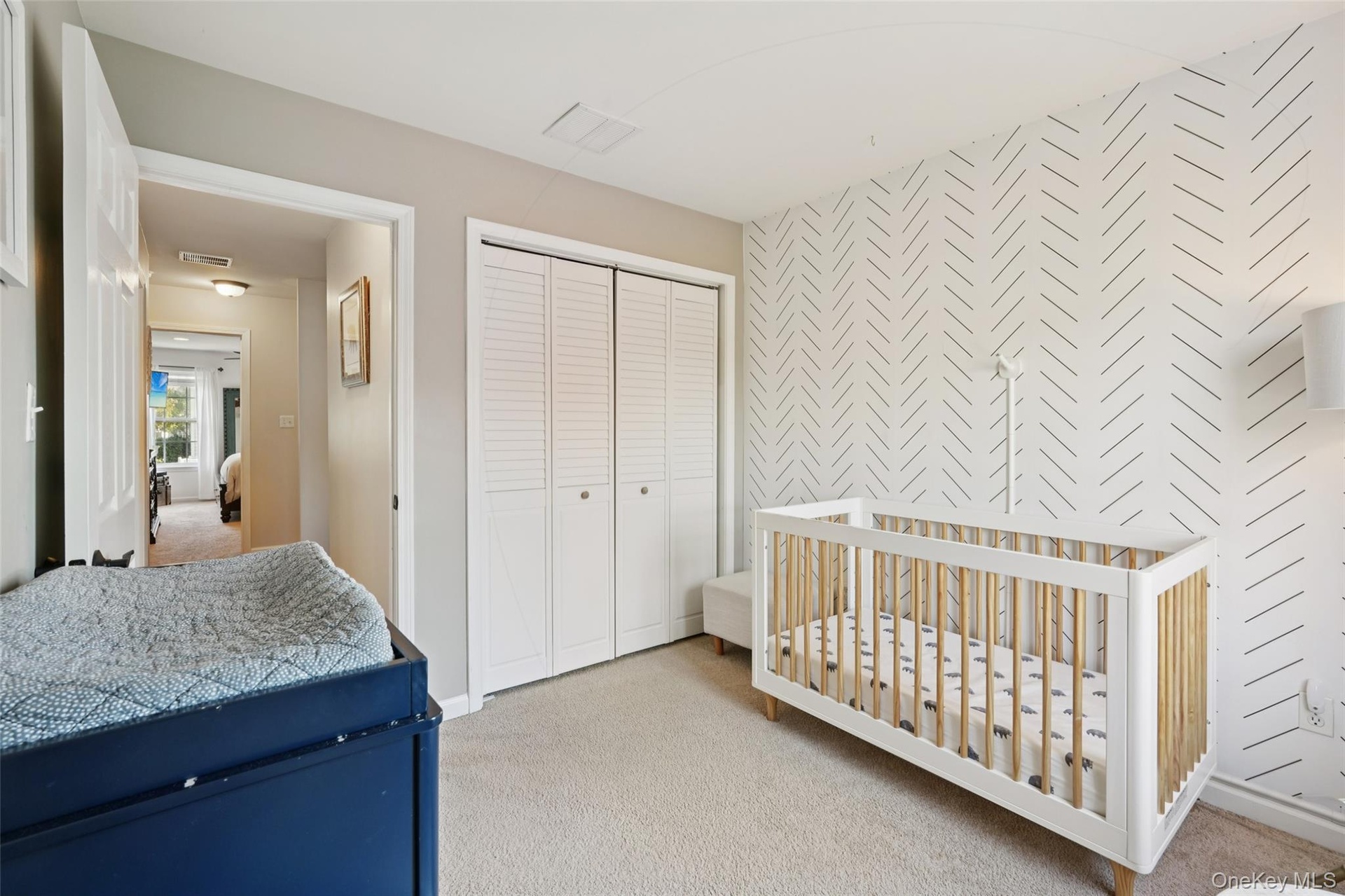 - Bedroom featuring light colored carpet, a closet, and a nursery area