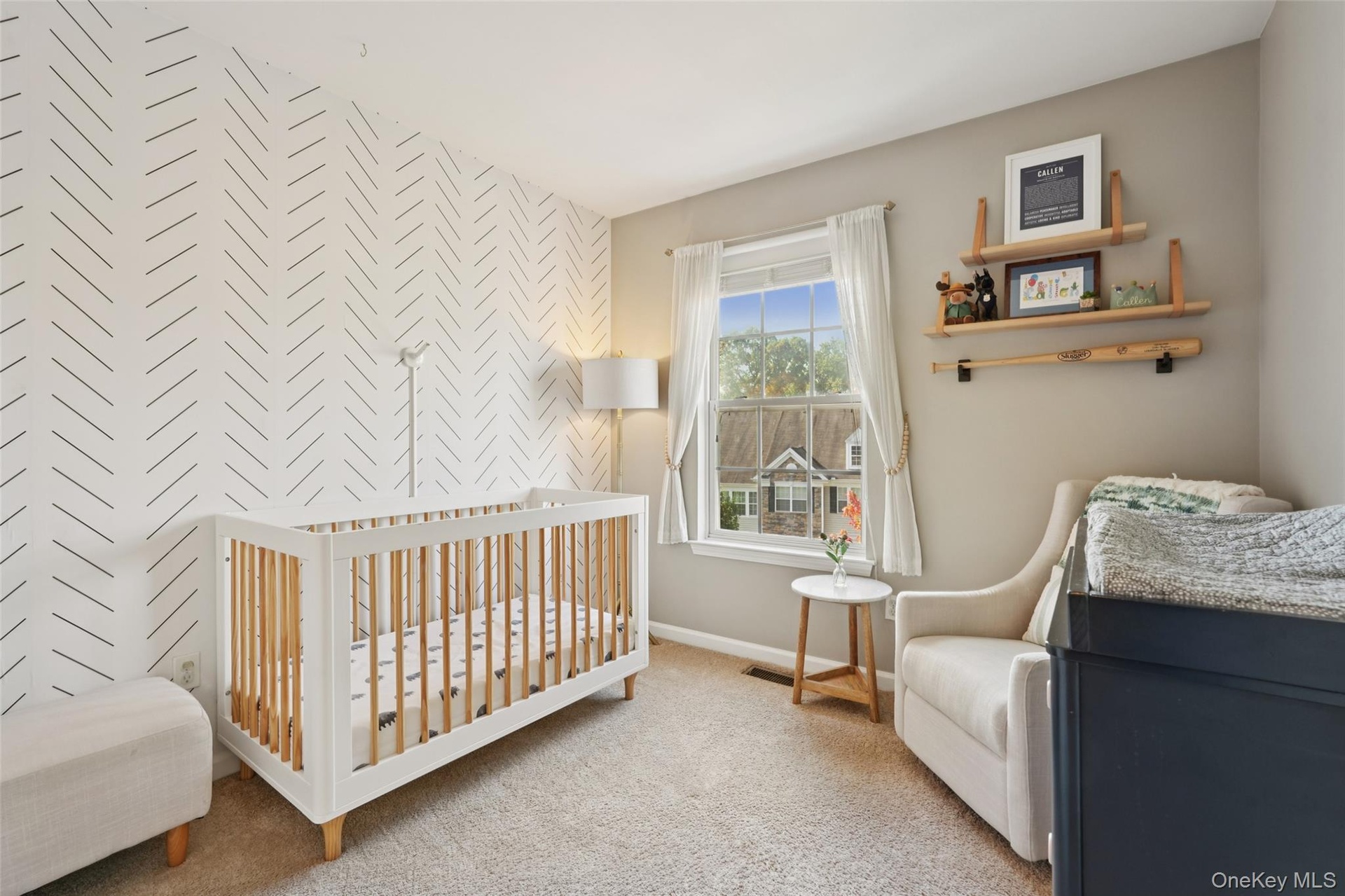 - Carpeted bedroom featuring a nursery area and an accent wall