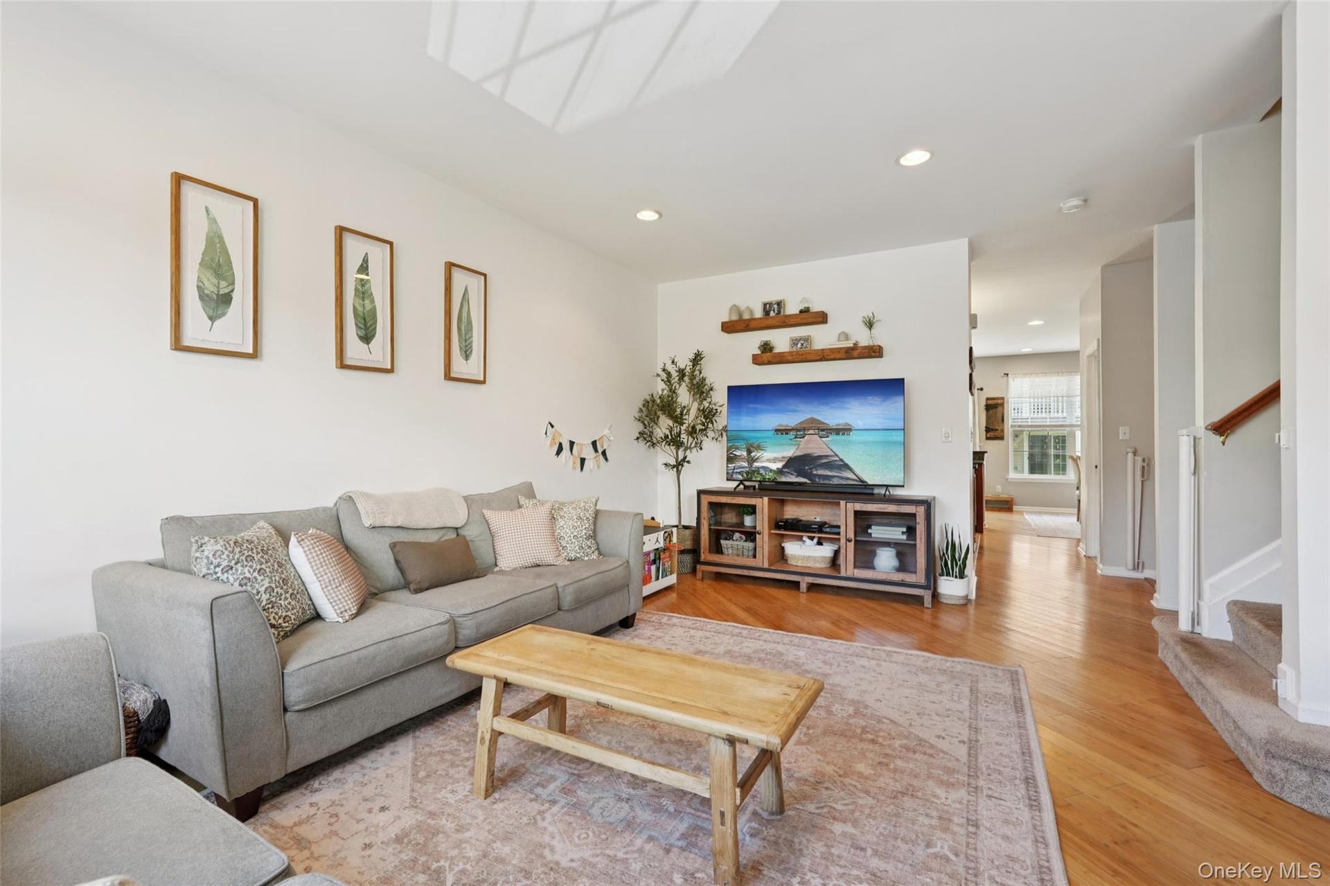 - Living area with recessed lighting, light wood-type flooring, and stairs