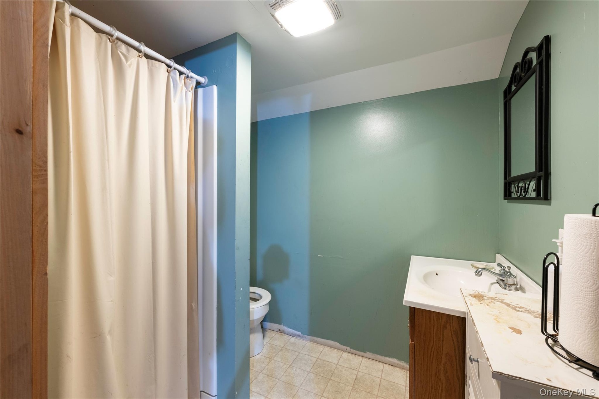 - Bathroom featuring baseboard heating, light tile patterned floors, vanity, and a shower with shower curtain
