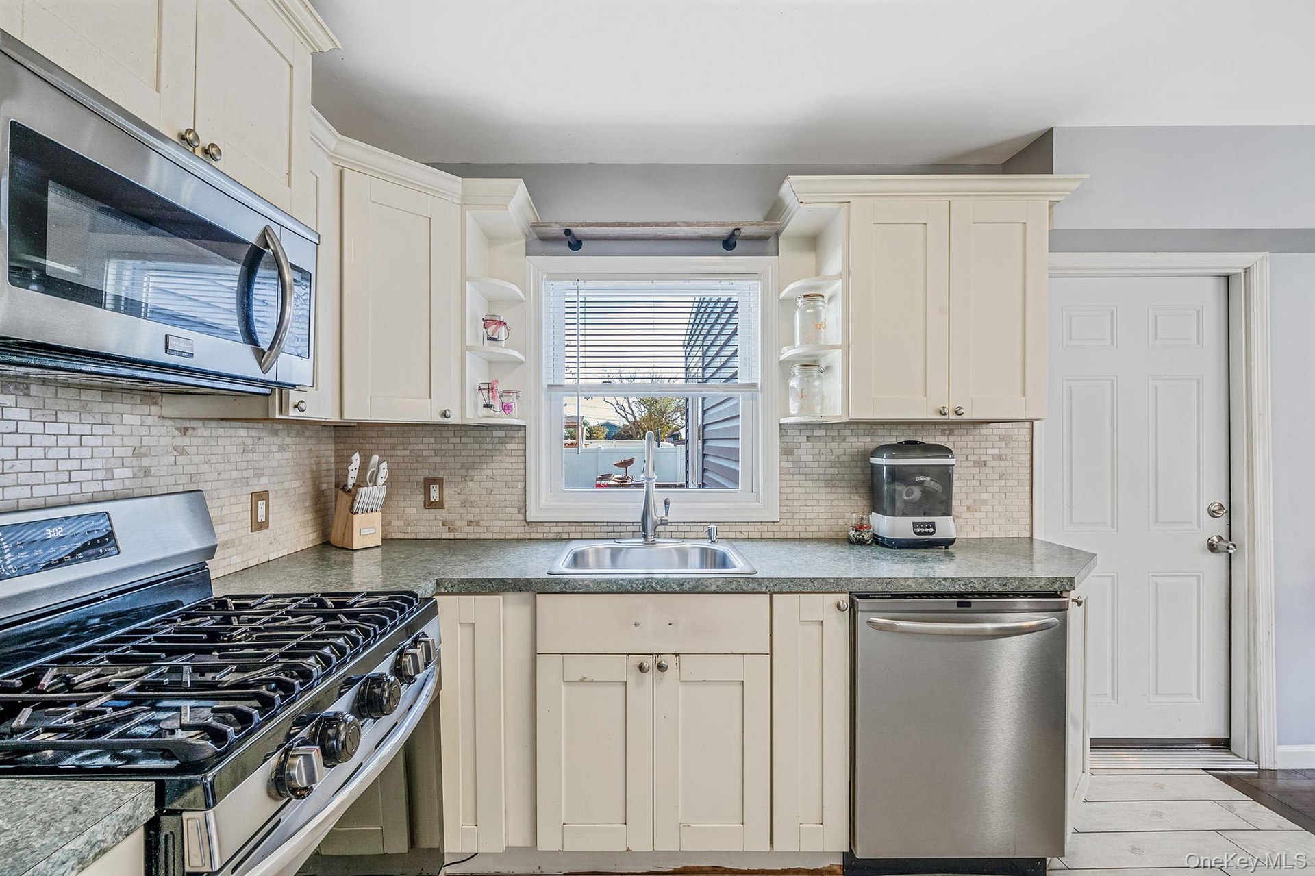 - Kitchen with appliances with stainless steel finishes, decorative backsplash, open shelves, and white cabinetry