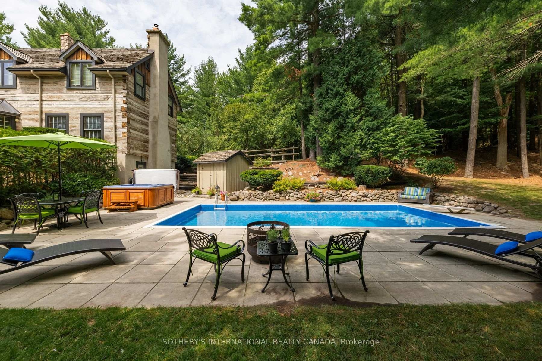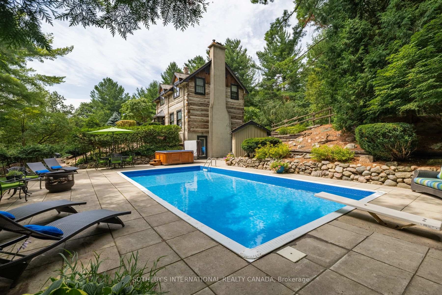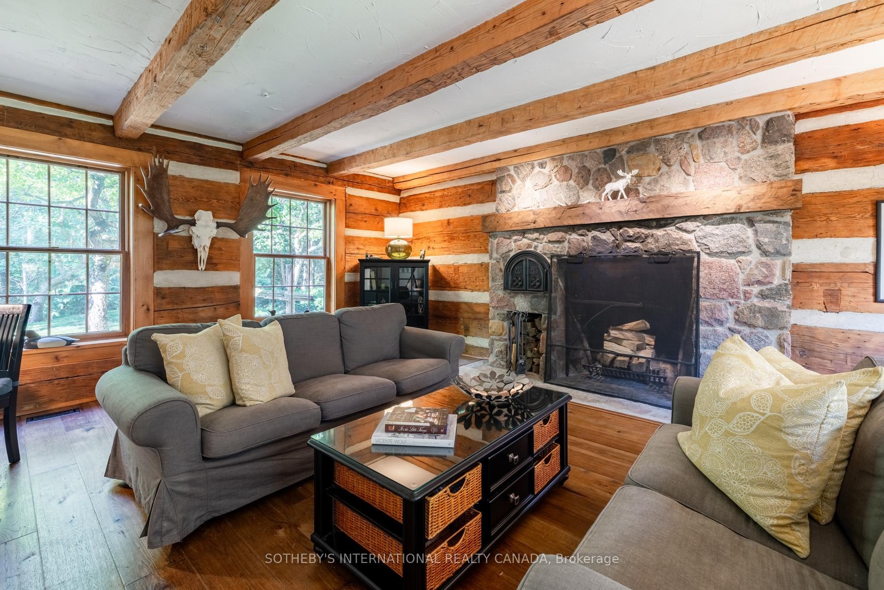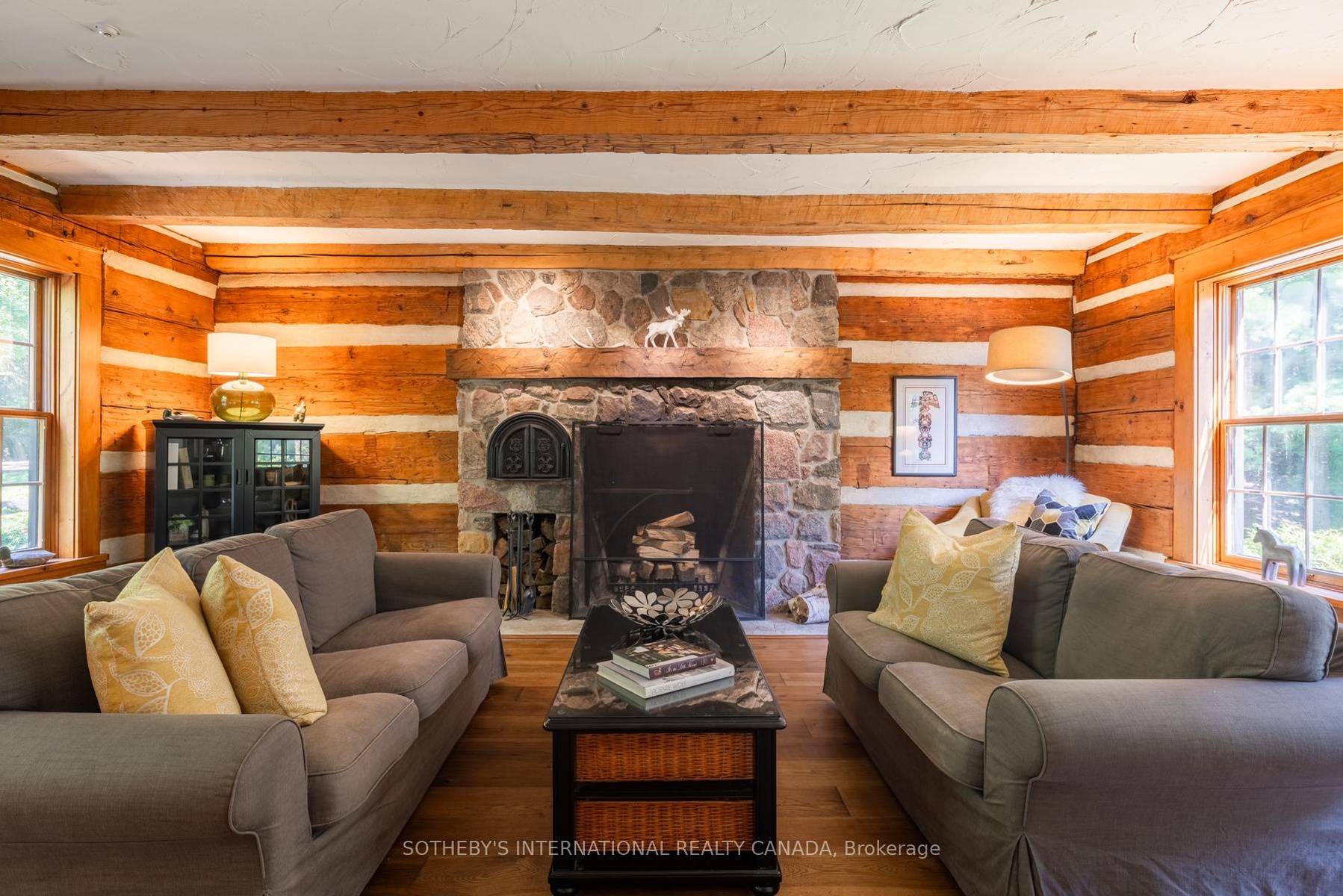 A property for all seasons; where swimming on a hot summer's day, a walk amongst falling leaves and time in a hot tub as the snow falls are all yours. This square log residence, sitting on over 10 acres, with a tasteful board and batten addition, really is the ideal country retreat. The best of both worlds come together with dinner in the city to then come home and wake up to the sound of birds and a flask of coffee on a crisp morning hike. Beginning with an inviting front hall, you find yourself drawn to an impressive stone fireplace with a built-in bread and pizza oven, perfect for late day gatherings. Throughout the main living area, beautiful hickory floors add warmth and character. The kitchen is truly the heart of the home, featuring soapstone counters, reclaimed natural oak flooring, a welcoming window seat, and exposed beams that evoke a rustic yet refined atmosphere. For those outdoor enthusiasts, a dedicated mudroom offers practical space for everything from dogs to hiking boots and hockey bags. The magic continues on the second floor with four charming bedrooms. The primary offers a spacious walk-in closet and an adjacent spa-like bathroom. Additional bedrooms provide ample space, including one that has been converted into a coveted dressing room. The lower level extends the living space with a family room complete with its own fireplace and walk-out as well as a separate area that could serve as a fifth bedroom or a quiet den. Plenty of storage ensures a place for everything. After some time in the sauna, a private outdoor oasis awaits with the pool and hot tub. This property is not just a home, it's a lovingly preserved piece of history, offering a rare opportunity for a unique and peaceful lifestyle. Ideal for those focused on exceptional independent schools, golf, horses and excellent commuting options from both King or Aurora.