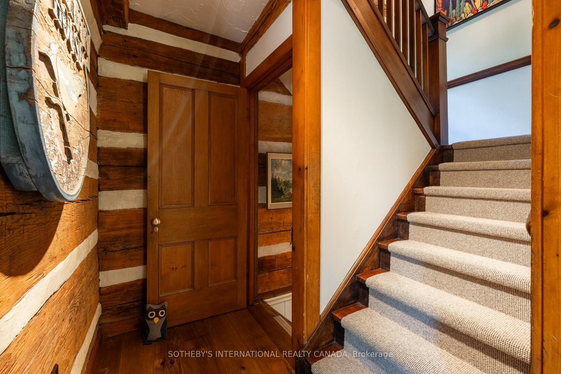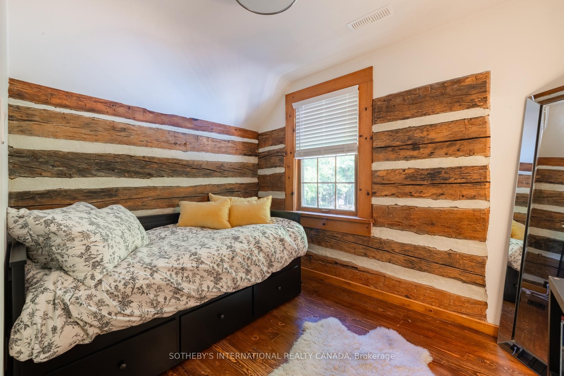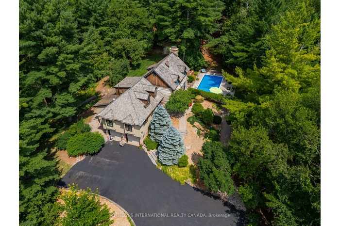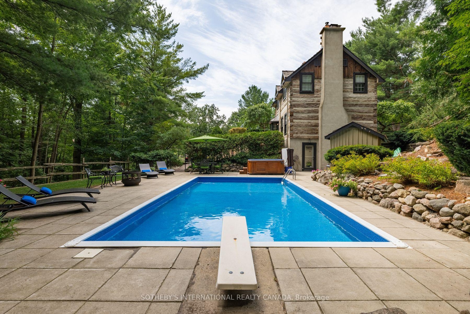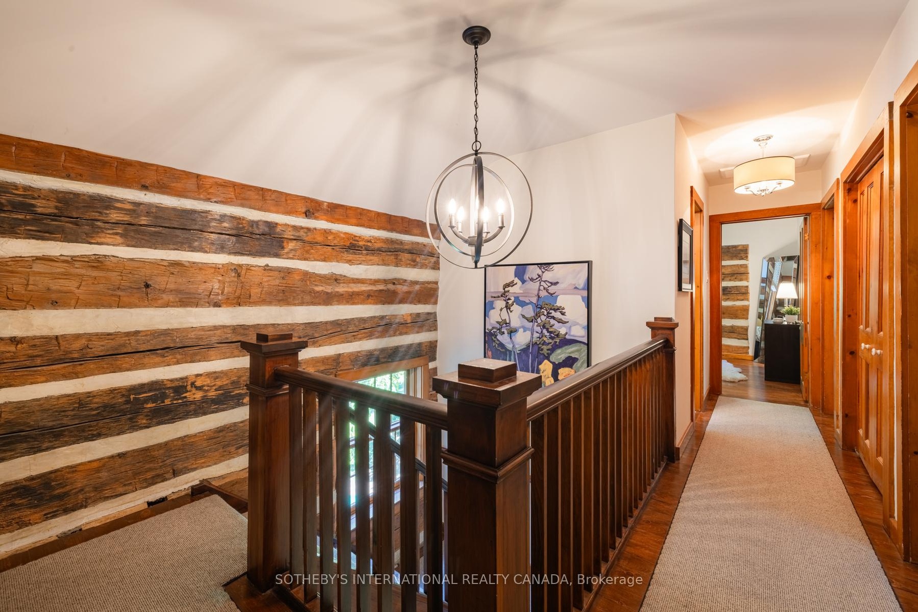 A property for all seasons; where swimming on a hot summer's day, a walk amongst falling leaves and time in a hot tub as the snow falls are all yours. This square log residence, sitting on over 10 acres, with a tasteful board and batten addition, really is the ideal country retreat. The best of both worlds come together with dinner in the city to then come home and wake up to the sound of birds and a flask of coffee on a crisp morning hike. Beginning with an inviting front hall, you find yourself drawn to an impressive stone fireplace with a built-in bread and pizza oven, perfect for late day gatherings. Throughout the main living area, beautiful hickory floors add warmth and character. The kitchen is truly the heart of the home, featuring soapstone counters, reclaimed natural oak flooring, a welcoming window seat, and exposed beams that evoke a rustic yet refined atmosphere. For those outdoor enthusiasts, a dedicated mudroom offers practical space for everything from dogs to hiking boots and hockey bags. The magic continues on the second floor with four charming bedrooms. The primary offers a spacious walk-in closet and an adjacent spa-like bathroom. Additional bedrooms provide ample space, including one that has been converted into a coveted dressing room. The lower level extends the living space with a family room complete with its own fireplace and walk-out as well as a separate area that could serve as a fifth bedroom or a quiet den. Plenty of storage ensures a place for everything. After some time in the sauna, a private outdoor oasis awaits with the pool and hot tub. This property is not just a home, it's a lovingly preserved piece of history, offering a rare opportunity for a unique and peaceful lifestyle. Ideal for those focused on exceptional independent schools, golf, horses and excellent commuting options from both King or Aurora.