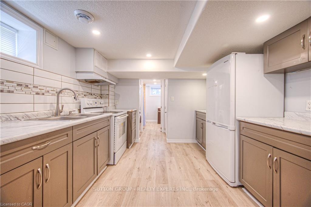 Location, Location, Location! Stunning basement apartment in a detached bungalow for lease in the highly sought-after Heritage Park/Rosemount neighbourhood. This beautifully maintained unit features 3 spacious bedrooms, 1 full bathroom, and a bright living and dining area. The modern kitchen offers white appliances and ample cabinet space. Freshly painted with vinyl flooring throughout. Separate laundry for tenant convenience. Conveniently located close to supermarkets, shopping centres, restaurants, major banks, schools, and parks. Excellent transit options nearby including Kitchener GO Station, with easy access to Highway 7/401 and Waterloo International Airport. Upper level not included. Utilities shared (Upper Tenant 70% / Basement Tenant 30%). Don't miss this opportunity to lease a beautiful home in one of Kitchener's most convenient and family-friendly neighbourhoods!