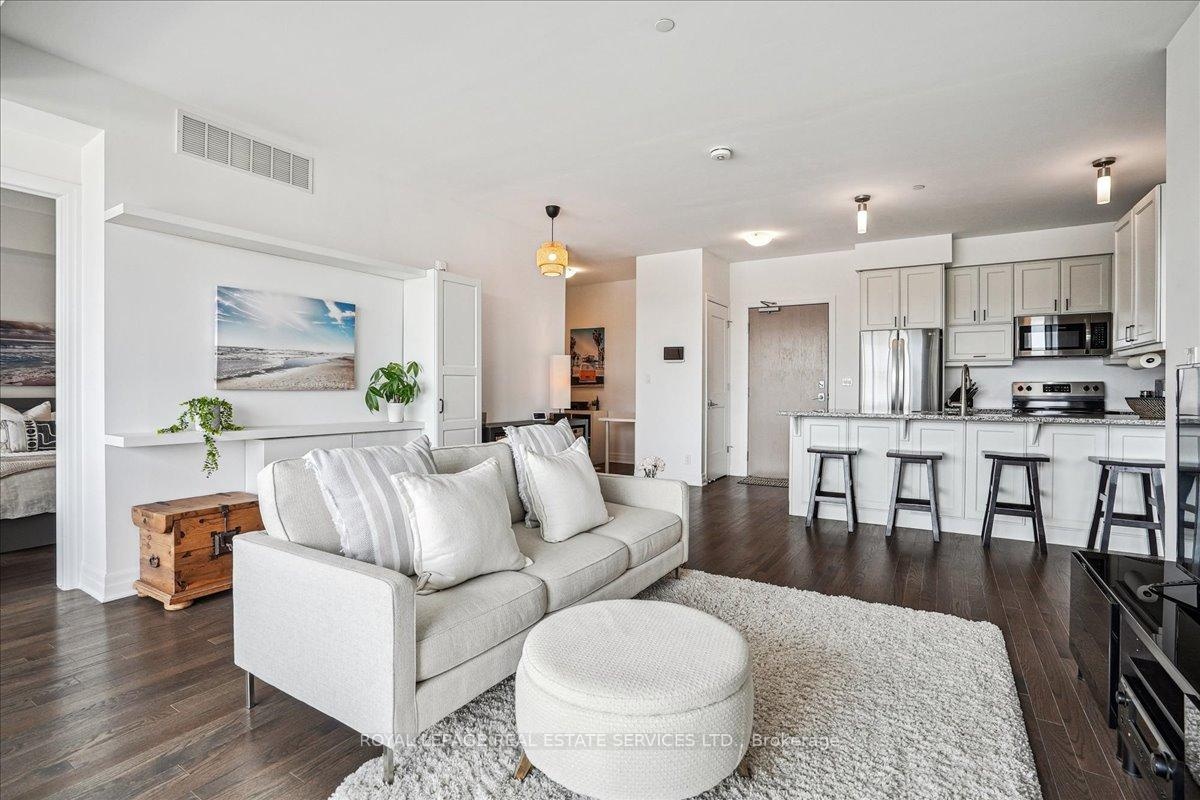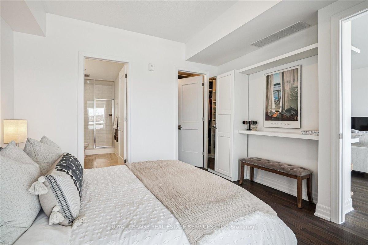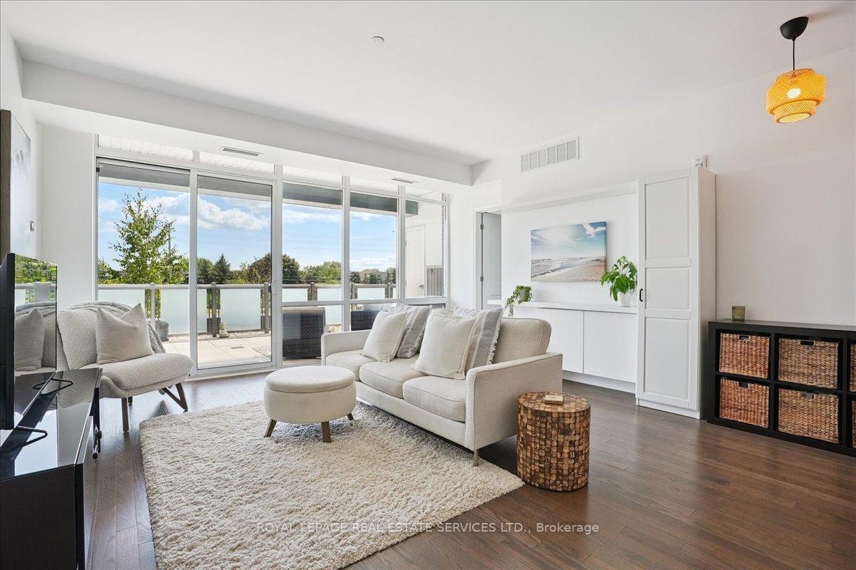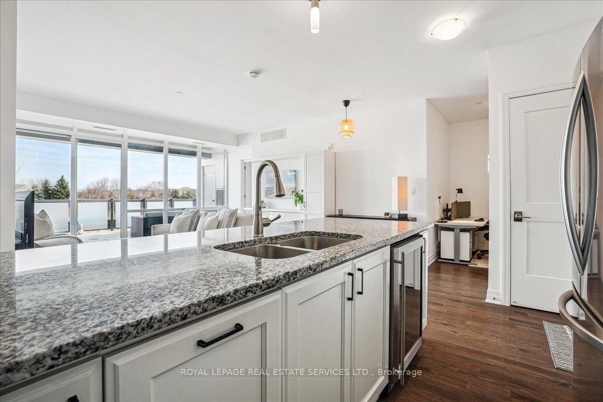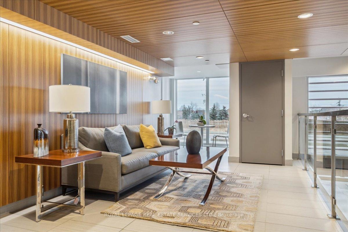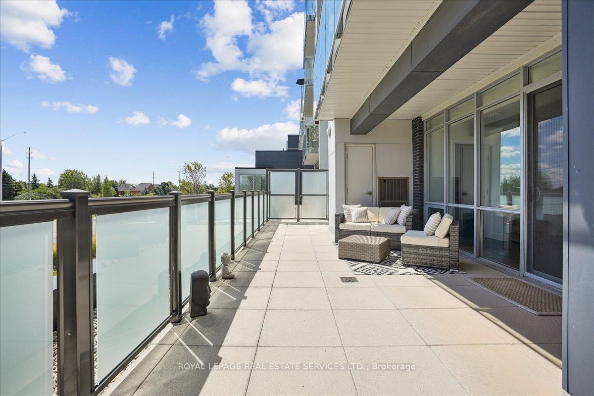 Stunning 2-bedroom + DEN condo offering 1,082 sq. ft. of beautifully finished living space, w/ a 423 sq. ft. private terrace featuring unobstructed south-facing views, the perfect spot to enjoy your morning coffee. Plus 2 car stacked parking. This home showcases engineered hardwood flooring throughout, 9 smooth ceilings, custom built-in shelving, & a true open-concept layout. Expansive great room is bathed in natural light thanks to wall-to-wall windows & flows effortlessly onto the terrace. The chef-inspired kitchen is a showstopper w/ extended white cabinetry, soft-close drawers, bi-fold lift uppers, granite countertops, stainless steel appliances, upgraded lighting, & an oversized breakfast bar perfect for casual dining or gathering with friends. The split-bedroom floor plan offers privacy. Primary suite featuring a walk-in closet with custom organizers, blackout blinds, & a spa-like 4-pc ensuite complete w/ a glass shower, double sinks, & classic subway tile. The second bedroom is generous, offering balcony views, closet organizers, & easy access to the main 4-pc bath. The den is a versatile space that can serve as a private office or reading nook, while in-suite laundry adds to the everyday convenience. The expansive terrace, measuring 37'8" x 12'7",offers the perfect blend of sun and shade, making it ideal for outdoor dining & lounging. This unit also includes a premium two-car stacked parking spot ($25,000 upgrade), along w/ a locker at underground level. Enjoy a refined boutique condo lifestyle w/ fantastic amenities including a lovely lobby, two-level party room, fully equipped fitness centre, rooftop terrace, ample visitor parking, & a dog washing station. Perfectly situated just steps to coffee shops, restaurants, shopping, & surrounded by scenic hiking trails, w/ easy access to the highway, transit, GO station, recreation centres, Oakville hospital, beautiful parks, & award-winning schools this incredible home truly has it all.