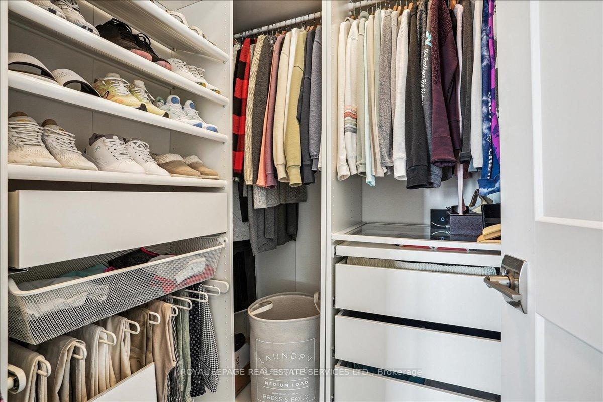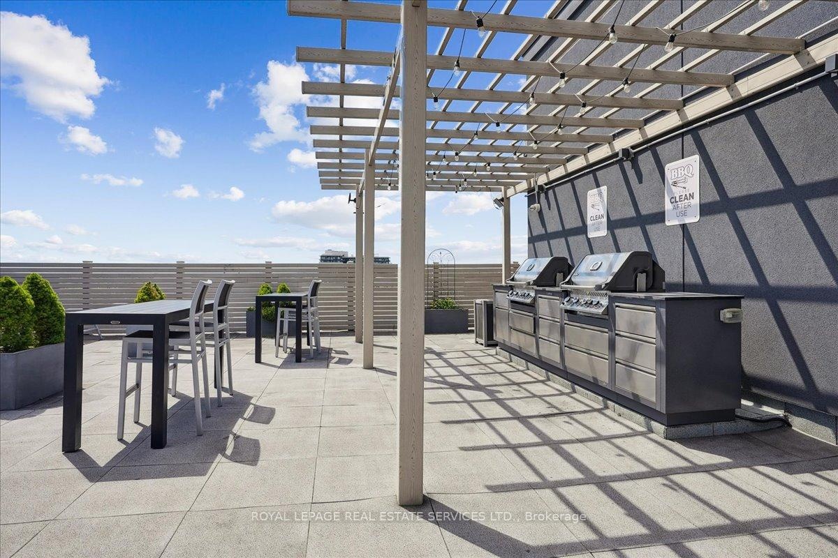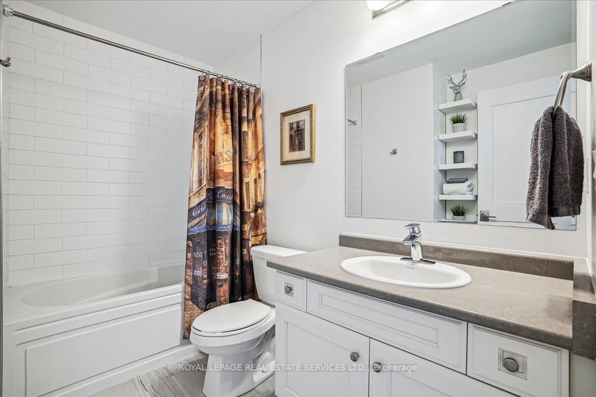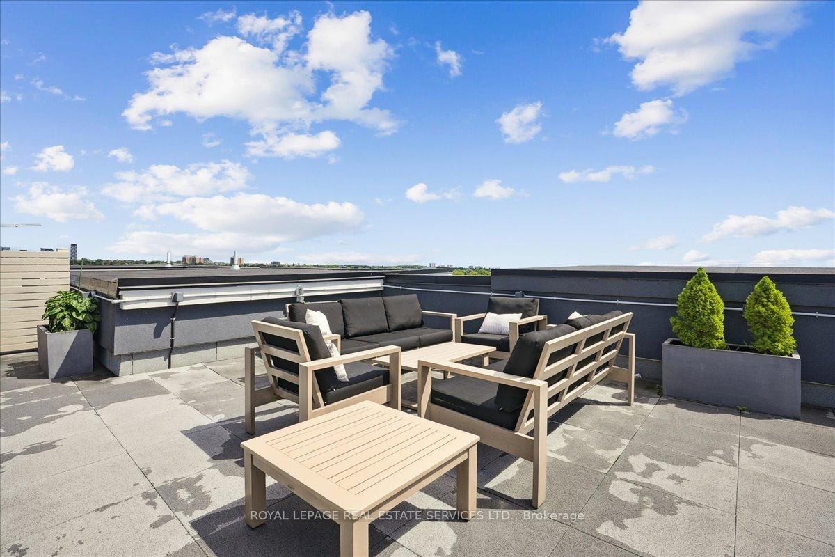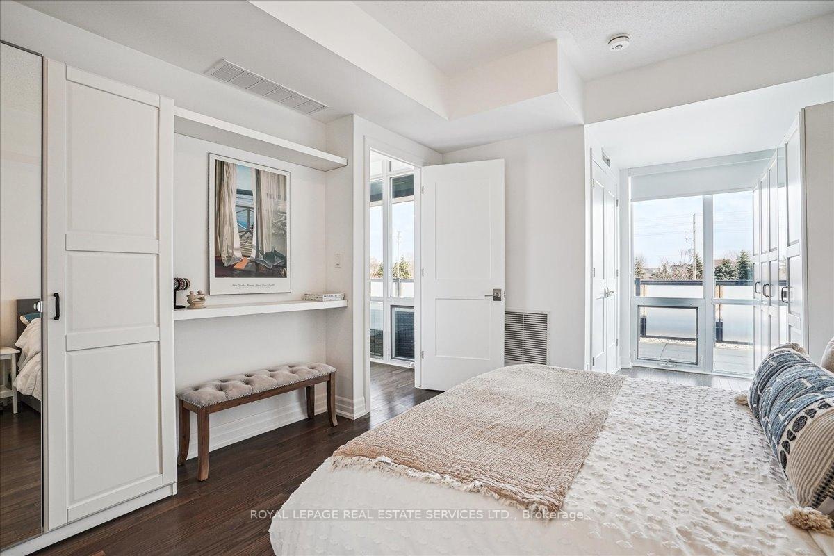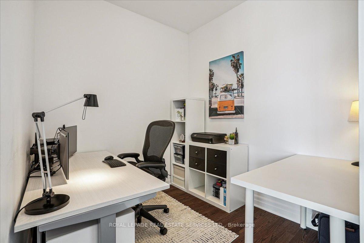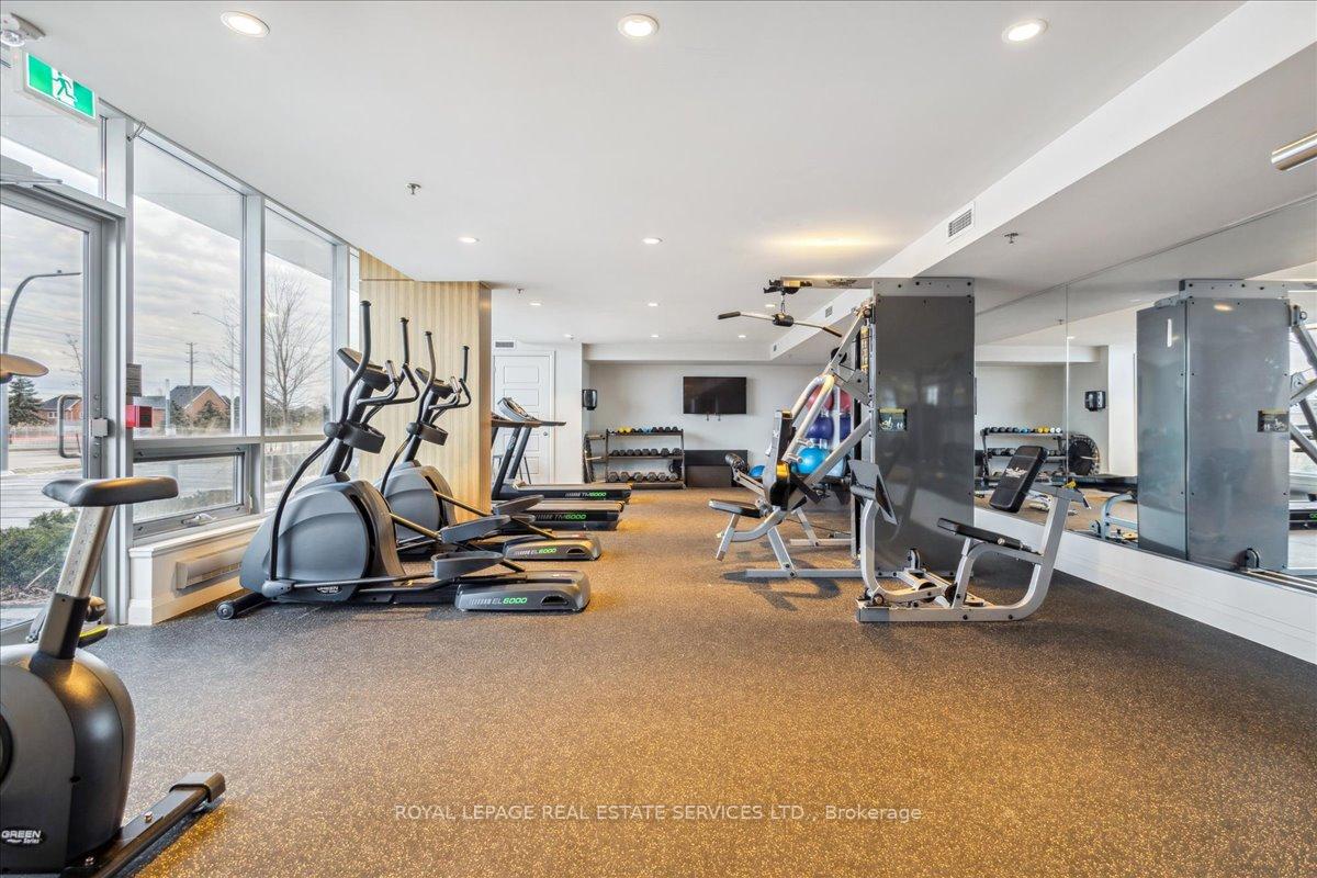 Stunning 2-bedroom + DEN condo offering 1,082 sq. ft. of beautifully finished living space, w/ a 423 sq. ft. private terrace featuring unobstructed south-facing views, the perfect spot to enjoy your morning coffee. Plus 2 car stacked parking. This home showcases engineered hardwood flooring throughout, 9 smooth ceilings, custom built-in shelving, & a true open-concept layout. Expansive great room is bathed in natural light thanks to wall-to-wall windows & flows effortlessly onto the terrace. The chef-inspired kitchen is a showstopper w/ extended white cabinetry, soft-close drawers, bi-fold lift uppers, granite countertops, stainless steel appliances, upgraded lighting, & an oversized breakfast bar perfect for casual dining or gathering with friends. The split-bedroom floor plan offers privacy. Primary suite featuring a walk-in closet with custom organizers, blackout blinds, & a spa-like 4-pc ensuite complete w/ a glass shower, double sinks, & classic subway tile. The second bedroom is generous, offering balcony views, closet organizers, & easy access to the main 4-pc bath. The den is a versatile space that can serve as a private office or reading nook, while in-suite laundry adds to the everyday convenience. The expansive terrace, measuring 37'8" x 12'7",offers the perfect blend of sun and shade, making it ideal for outdoor dining & lounging. This unit also includes a premium two-car stacked parking spot ($25,000 upgrade), along w/ a locker at underground level. Enjoy a refined boutique condo lifestyle w/ fantastic amenities including a lovely lobby, two-level party room, fully equipped fitness centre, rooftop terrace, ample visitor parking, & a dog washing station. Perfectly situated just steps to coffee shops, restaurants, shopping, & surrounded by scenic hiking trails, w/ easy access to the highway, transit, GO station, recreation centres, Oakville hospital, beautiful parks, & award-winning schools this incredible home truly has it all.