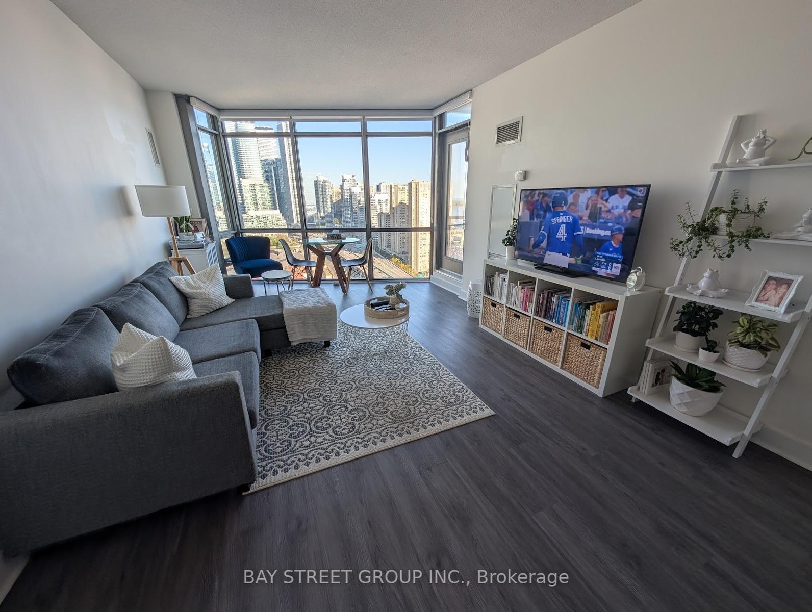 Enjoy high-floor panoramic view of downtown skyline, Lake Ontario, and into Rogers Centre! Walking distance to downtown PATH network and public transit. Unit refreshed in 2019 with new floors, kitchen, and bathrooms. Highly functional split layout. Master bedroom has walk-in closet and en-suite bathroom with walk-in shower. 2nd bathroom has luxury Jacuzzi bathtub. Large den that could be conveniently used as a 3rd room/office. Custom-designed kitchen with high-end appliances including gas cooktop, built-in dishwasher, counter-depth fridge, and built-in combo microwave oven. World-class amenities at SuperClub includes in-house RMT, 25m pool, sauna, fitness centre, ping pong, billiards, bowling, squash court, outdoor tennis court, a full size gym, indoor & outdoor playgrounds, and much more! Hydro, water, gas all included! Parking spot immediately outside elevator entrance!