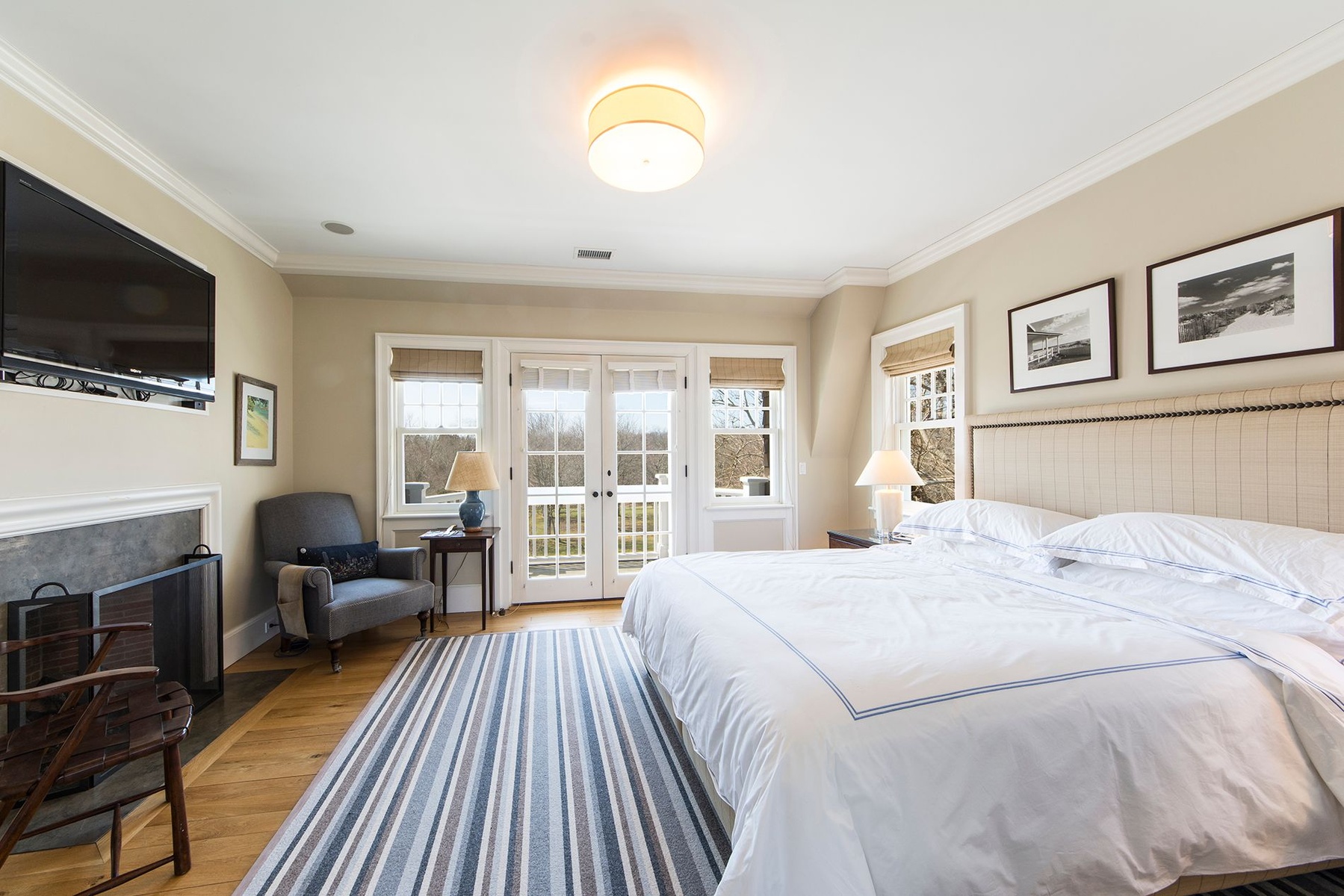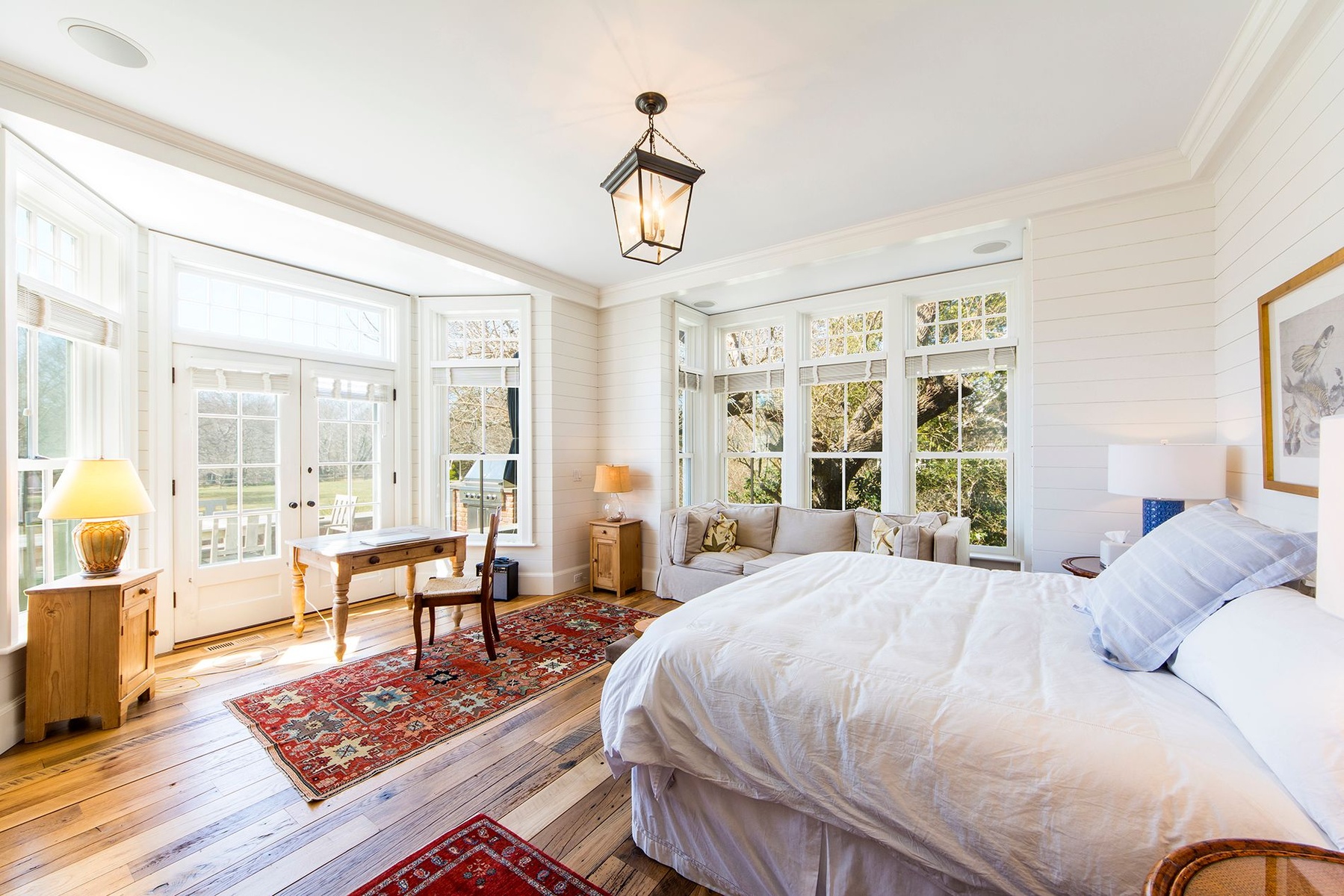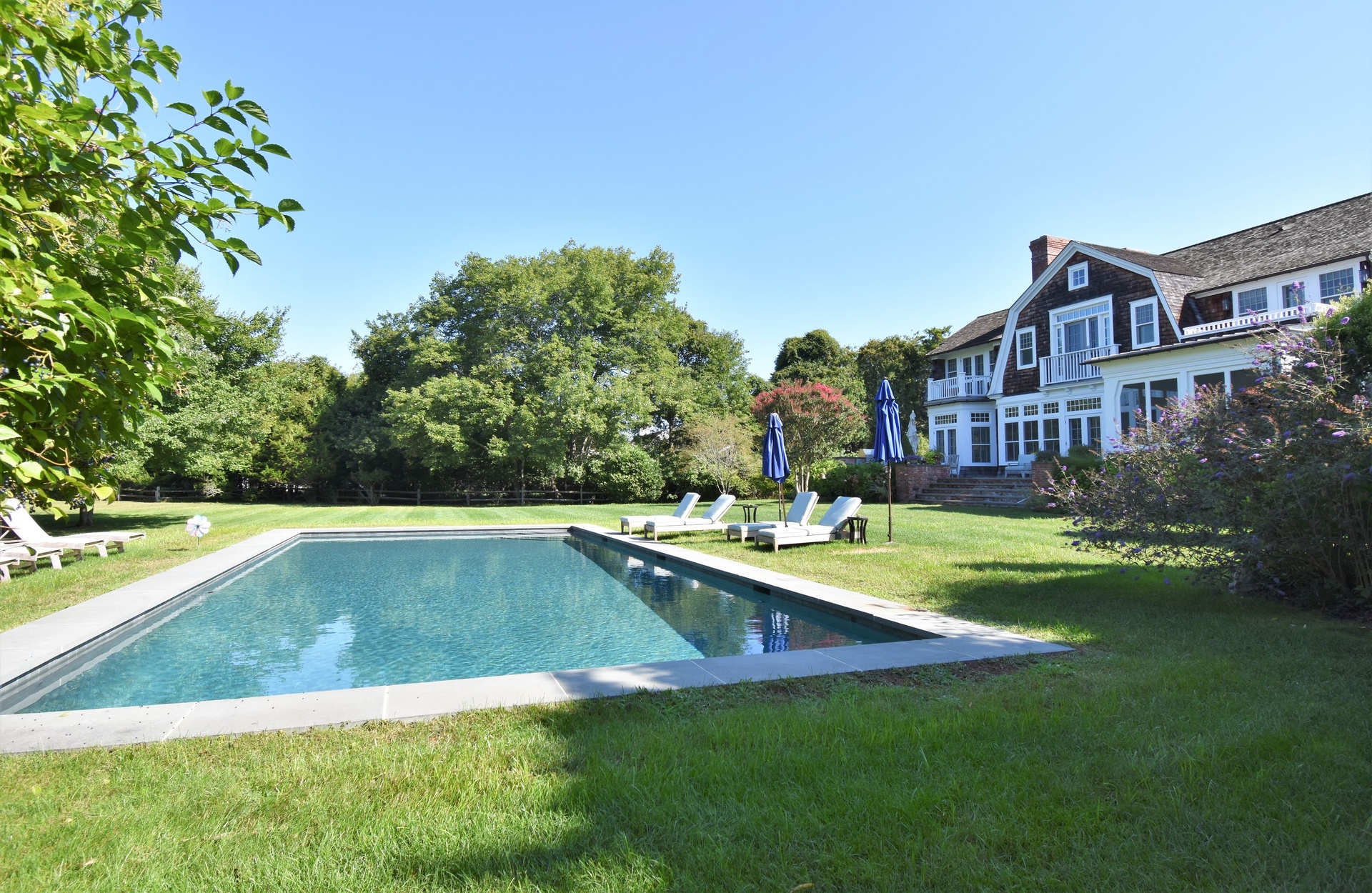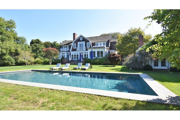 Traditional house and studio cottage in one of the few areas of East Hampton village that enjoys the rare combination of close proximity to both ocean beaches and village restaurants and shops. The 5,000 sq.ft. house designed by architect Peter Schulte features gracious proportions, high ceilings and beautiful details throughout. Ground floor comprises entry stair hall; sunny step-down living room with French doors to bluestone terrace; library, den; master bedroom and bath; open plan kitchen and dining room; screened porch. Second floor finds main master bedroom suite including office and balcony; three en-suite bedrooms. Five fireplaces. The finished lower level includes an additional bedroom and bath, wine room and recreation room. A separate studio cottage features a living room with fireplace and full bath and outside shower. The 1.45 acre grounds are the perfect setting for the 45' pool and are extremely private, abutting Hook Pond estuary and a large nature preserve to the west and opposite Egypt Green to the east. Near Old Beach Lane and Wiborg ocean beaches.