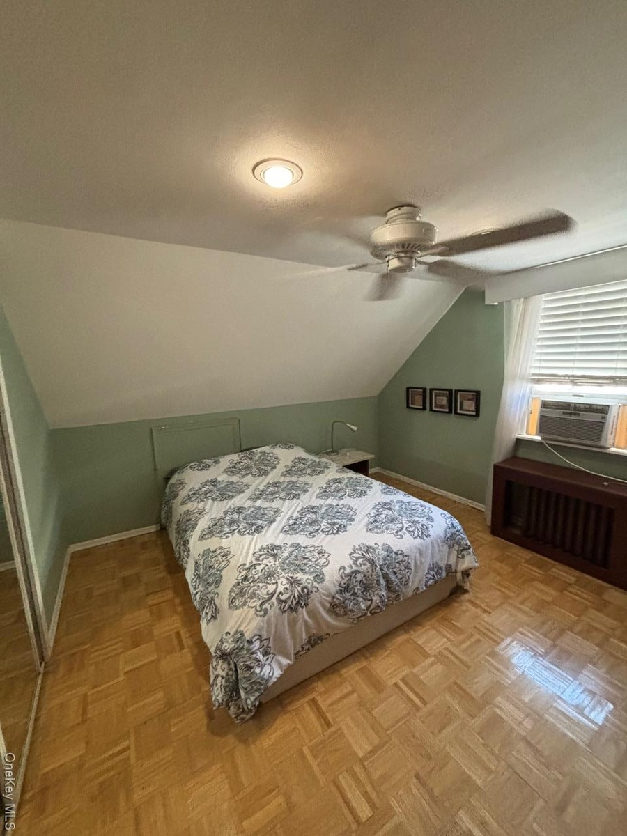- Bedroom with radiator heating unit, ceiling fan, and lofted ceiling