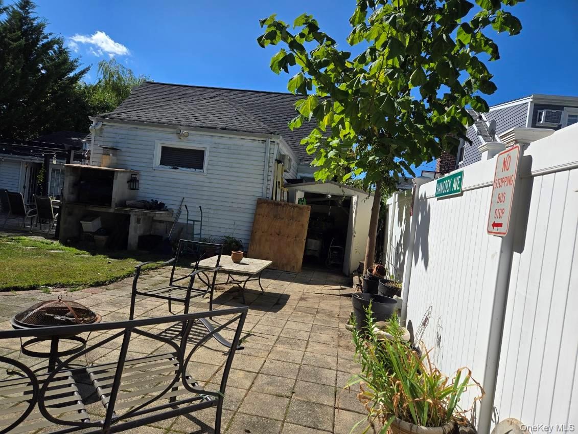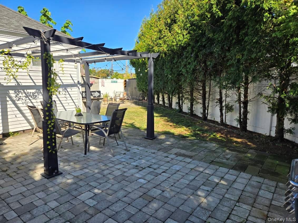 - Fenced backyard with a pergola, outdoor dining space, and a patio area