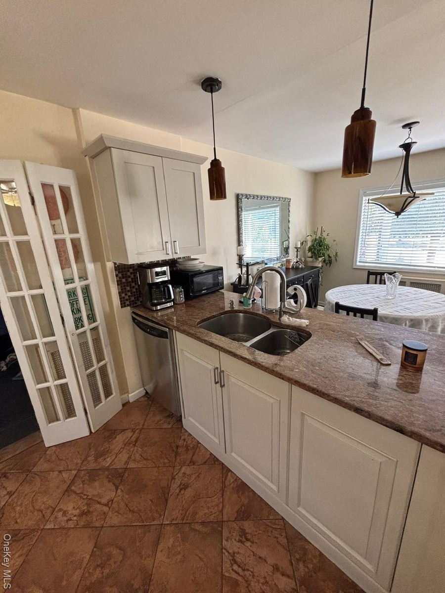 - Kitchen with dark stone countertops, pendant lighting, and white cabinetry