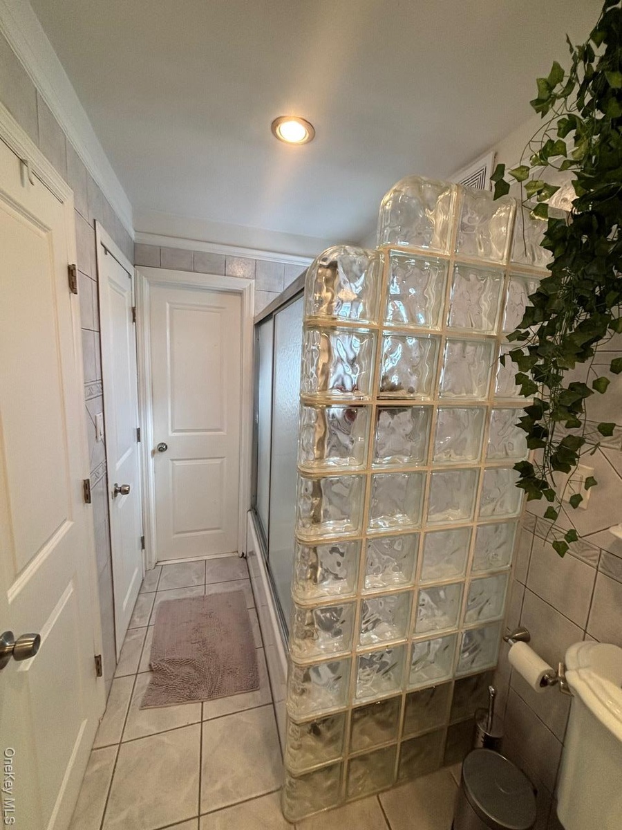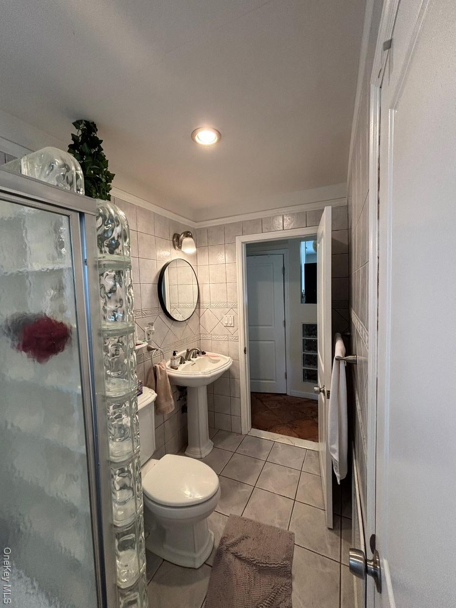 - Full bathroom with light tile patterned flooring, tile walls, recessed lighting, and an enclosed shower