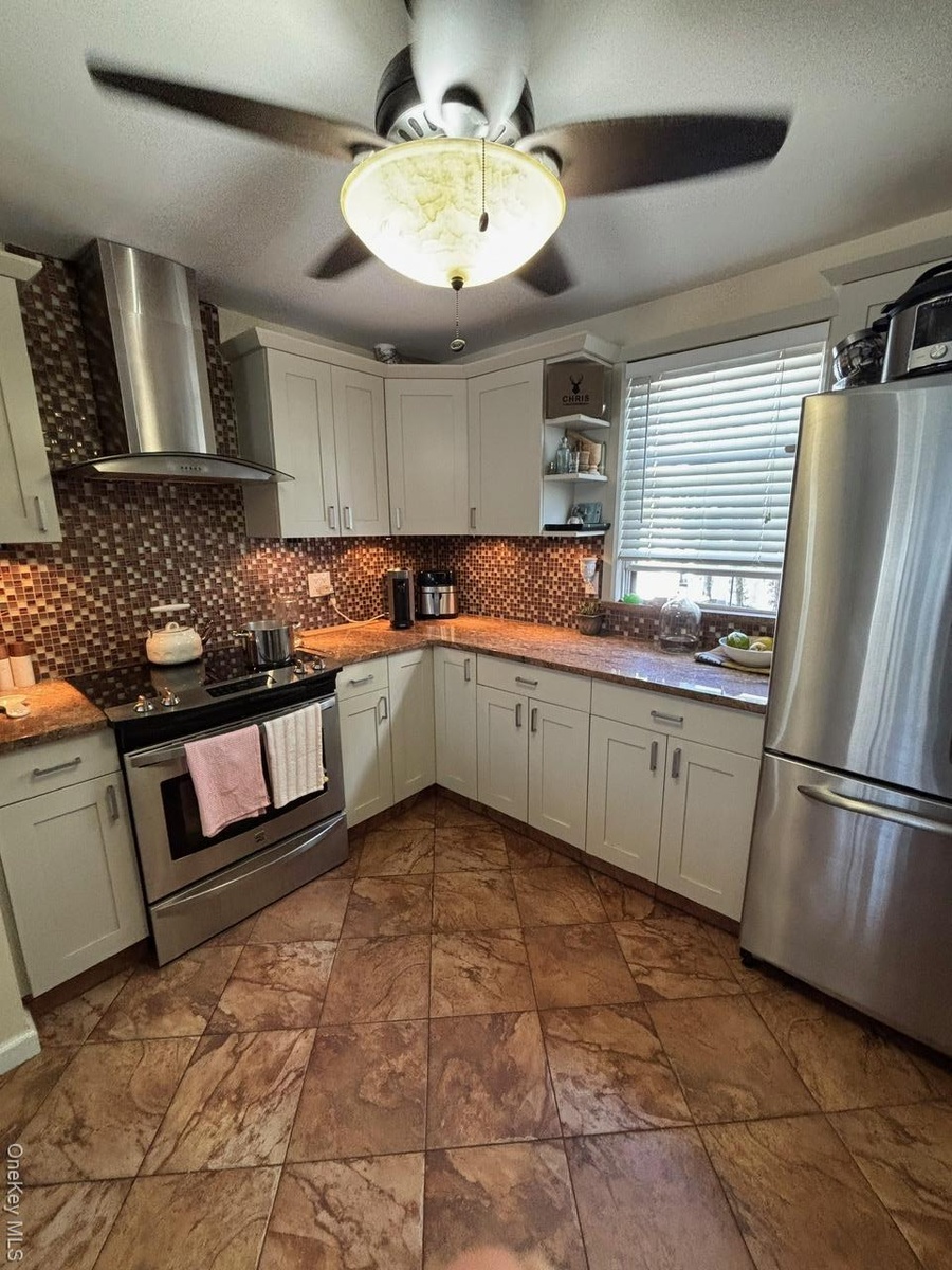 - Kitchen featuring fridge, stainless steel range oven, backsplash, ventilation hood, and open shelves