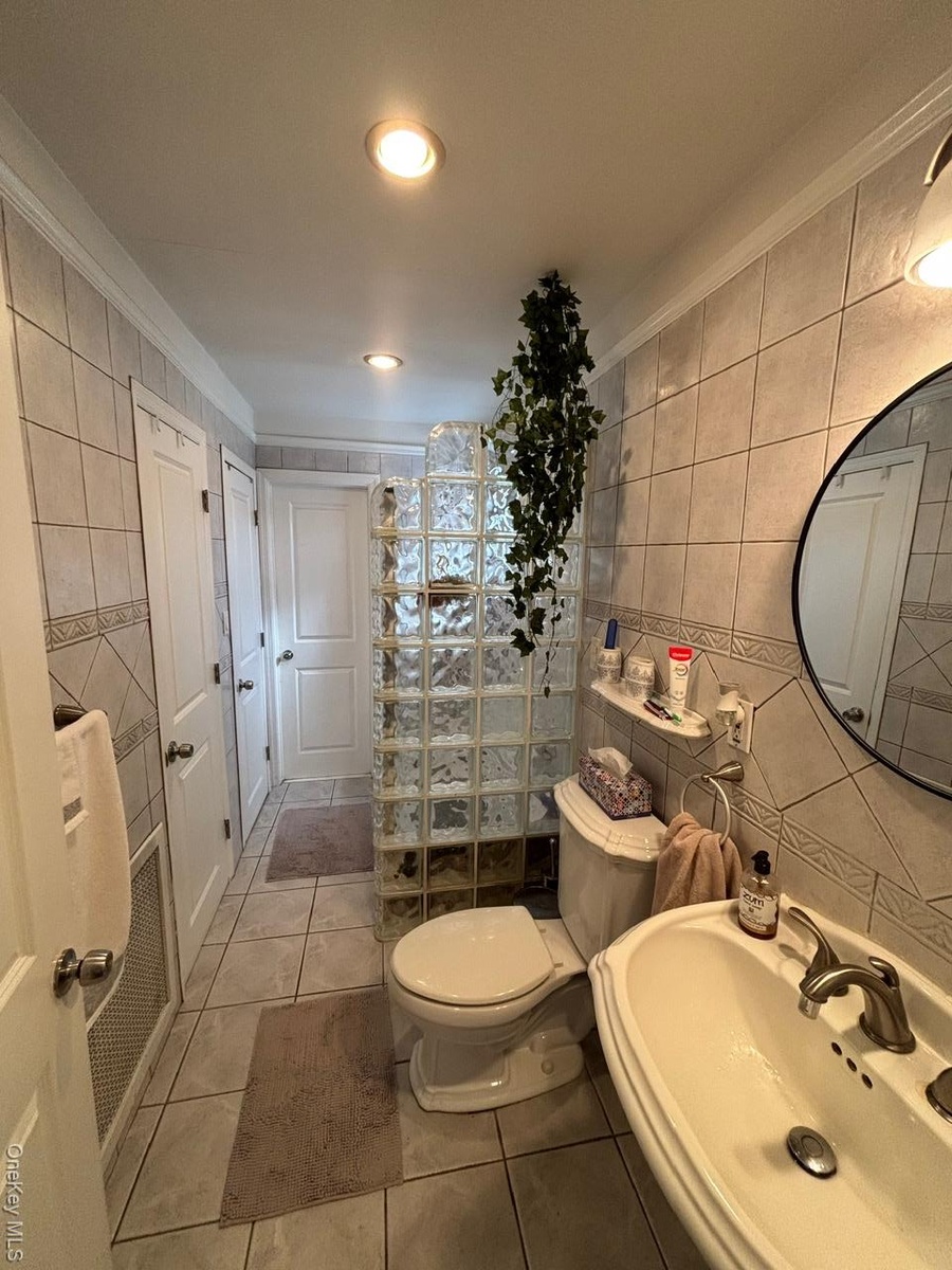 - Full bathroom with tile walls, light tile patterned floors, ornamental molding, recessed lighting, and tasteful backsplash