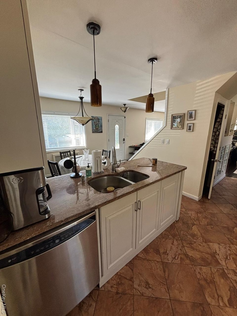 - Kitchen with hanging light fixtures, dishwashing machine, dark stone counters, and healthy amount of natural light