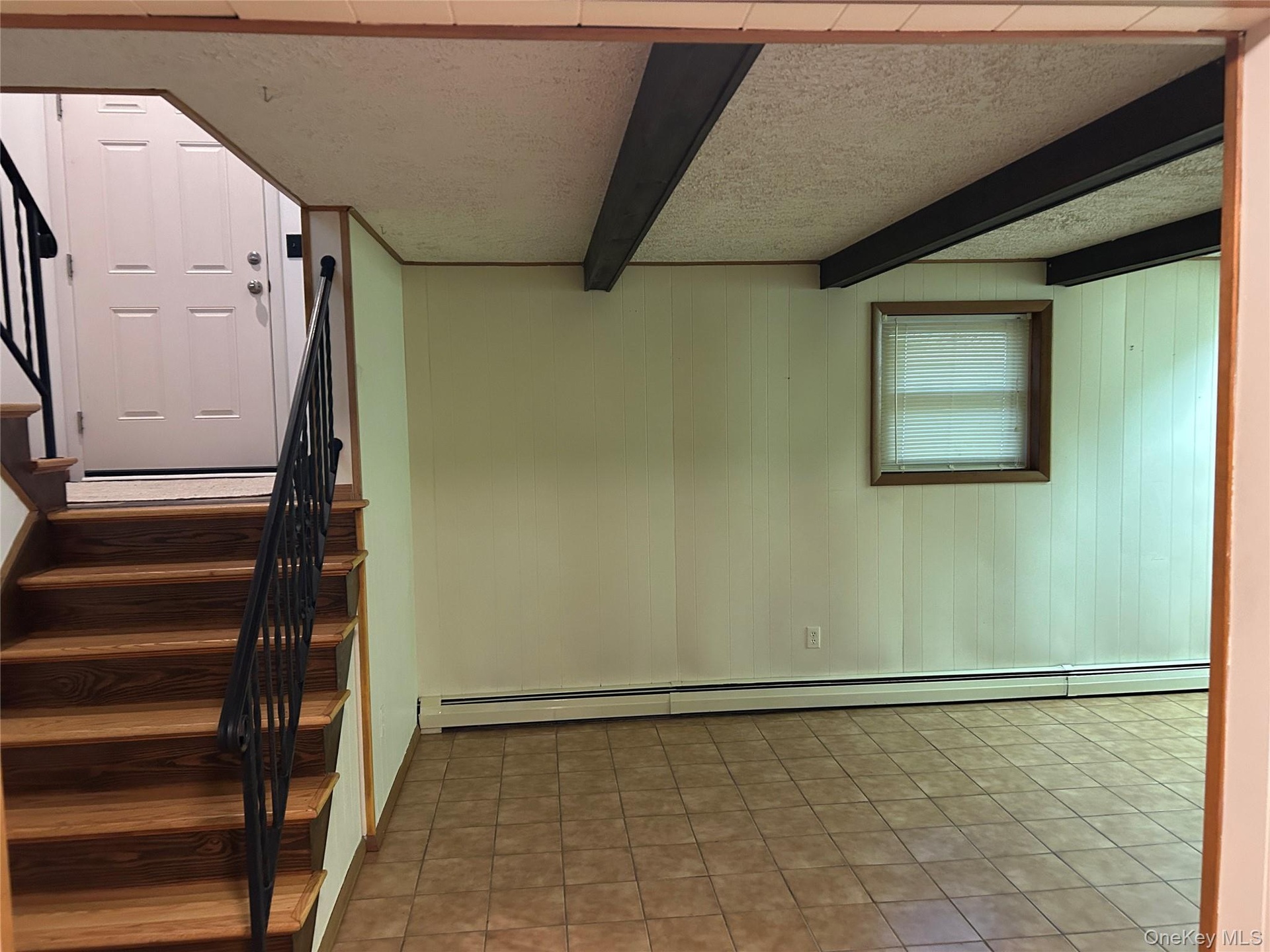 - Finished basement with tile patterned flooring, stairway, wooden walls, a textured ceiling, and a baseboard heating unit