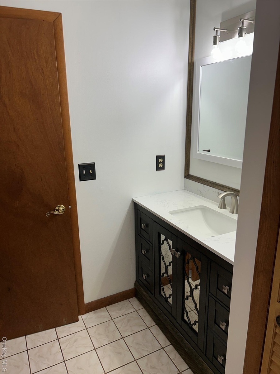 - Half bathroom featuring light tile patterned floors, a closet, vanity, a baseboard radiator, and tile walls