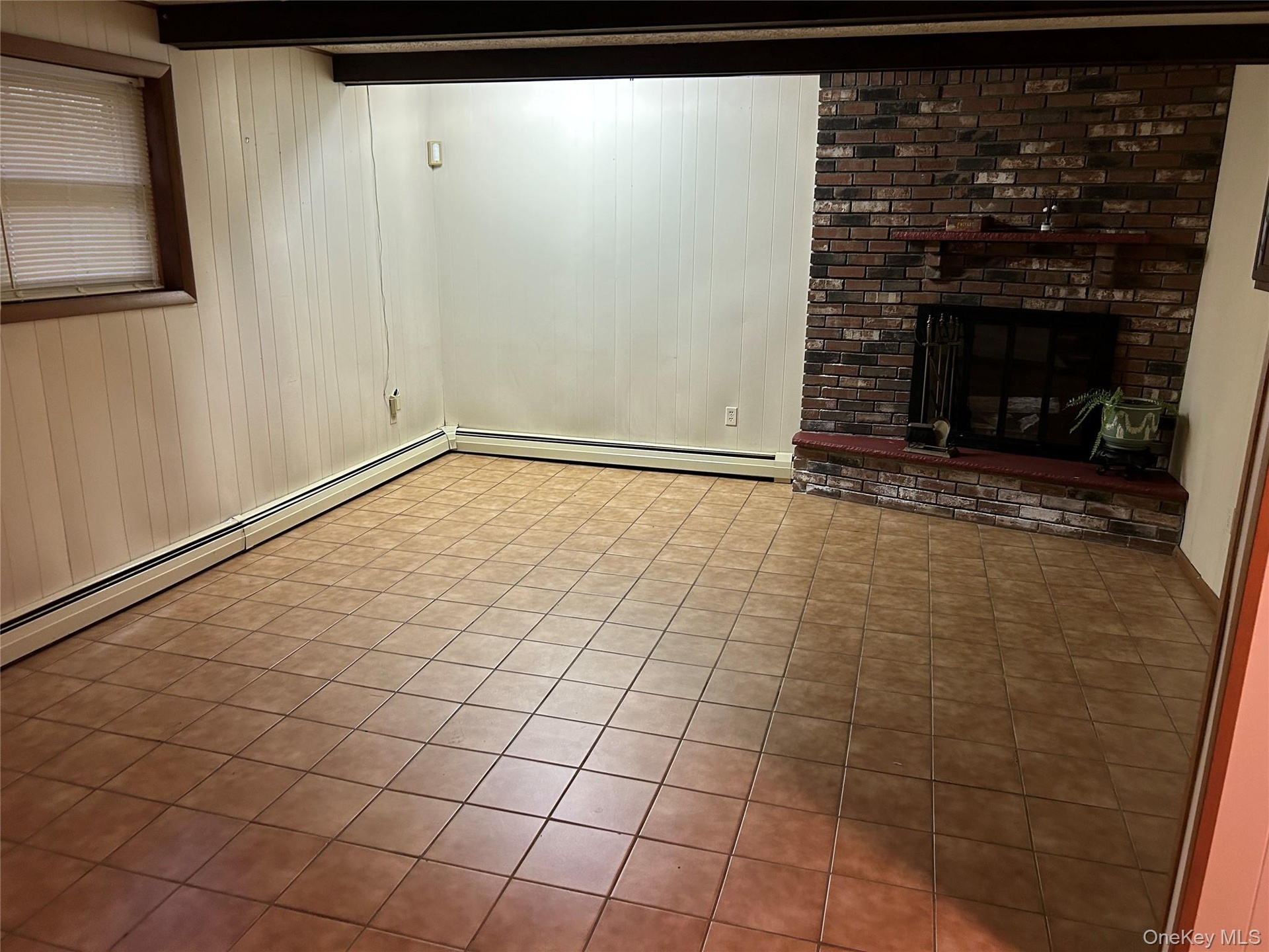 - Unfurnished living room with wood walls, a brick fireplace, light tile patterned flooring, a baseboard heating unit, and beamed ceiling