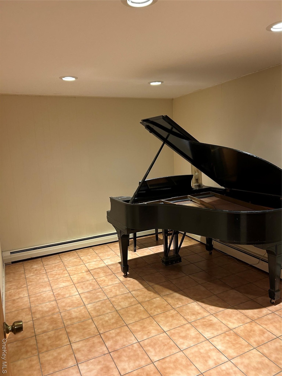 - Living area with light tile patterned floors, recessed lighting, and a baseboard radiator