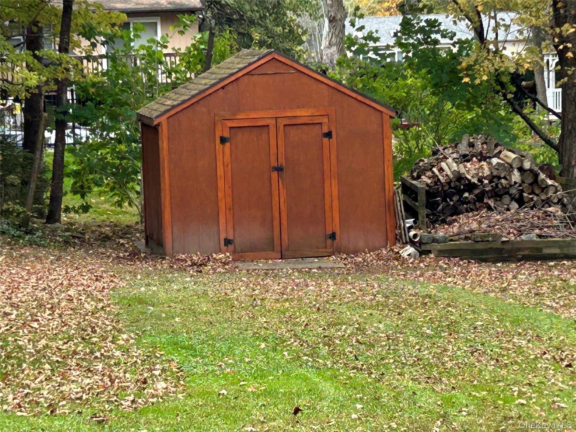- View of yard with a storage shed, a garden, and view of scattered trees