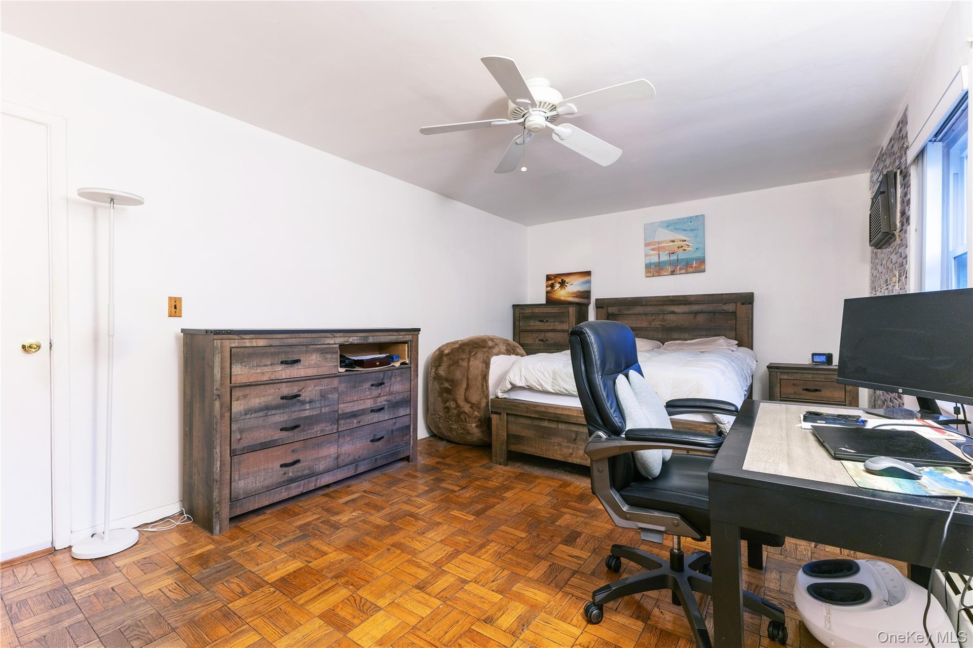 - Bedroom with a ceiling fan, a desk, and an AC wall unit