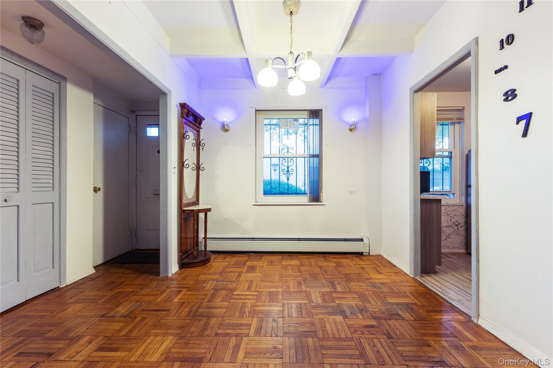 - Unfurnished dining area featuring beamed ceiling, coffered ceiling, healthy amount of natural light, a chandelier, and baseboard heating