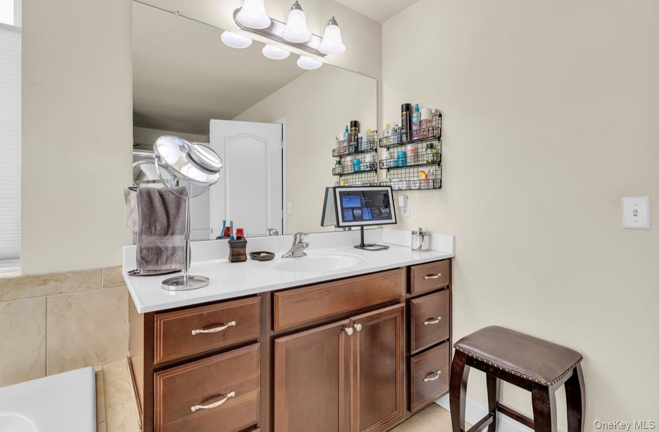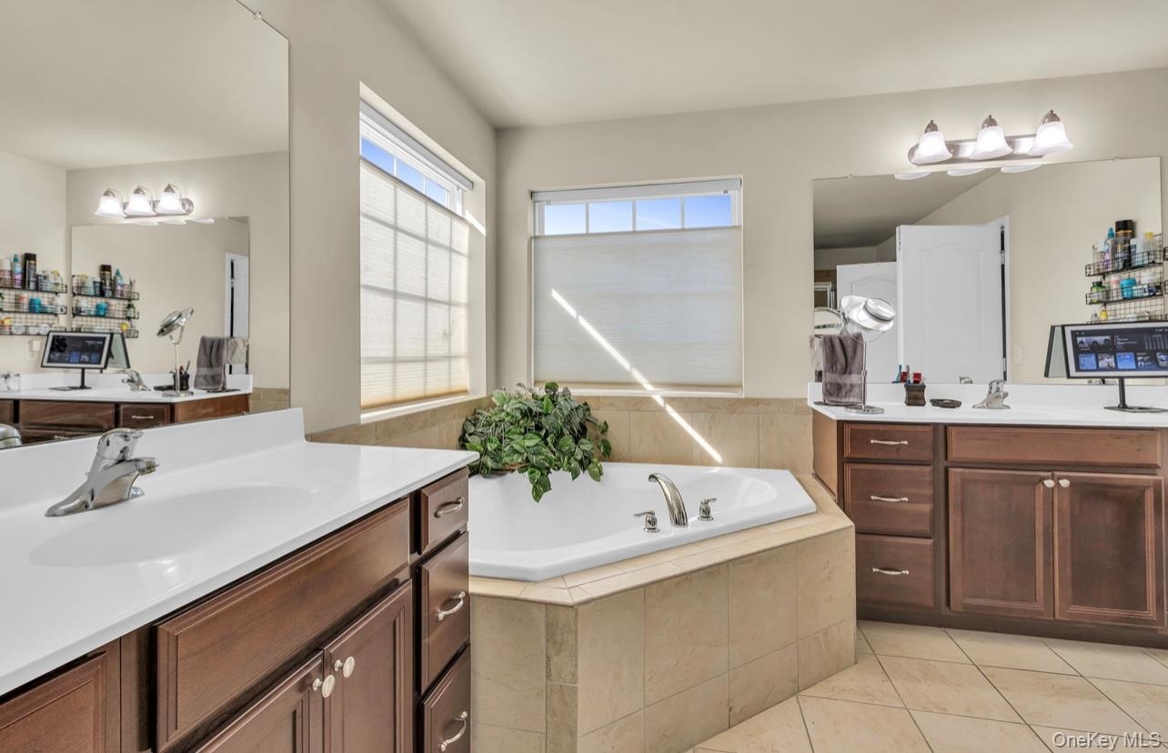 - Bathroom with vanity and a garden tub